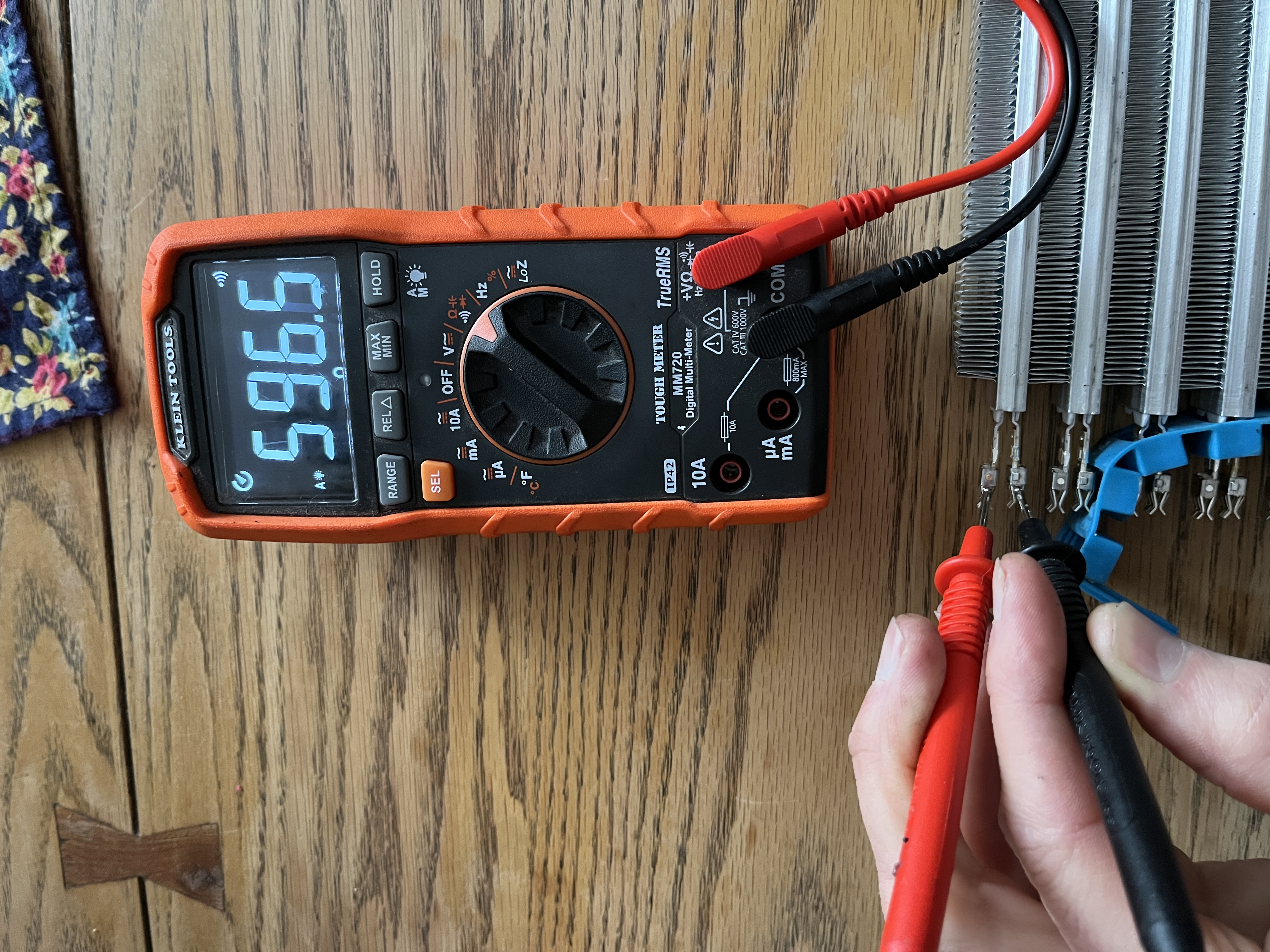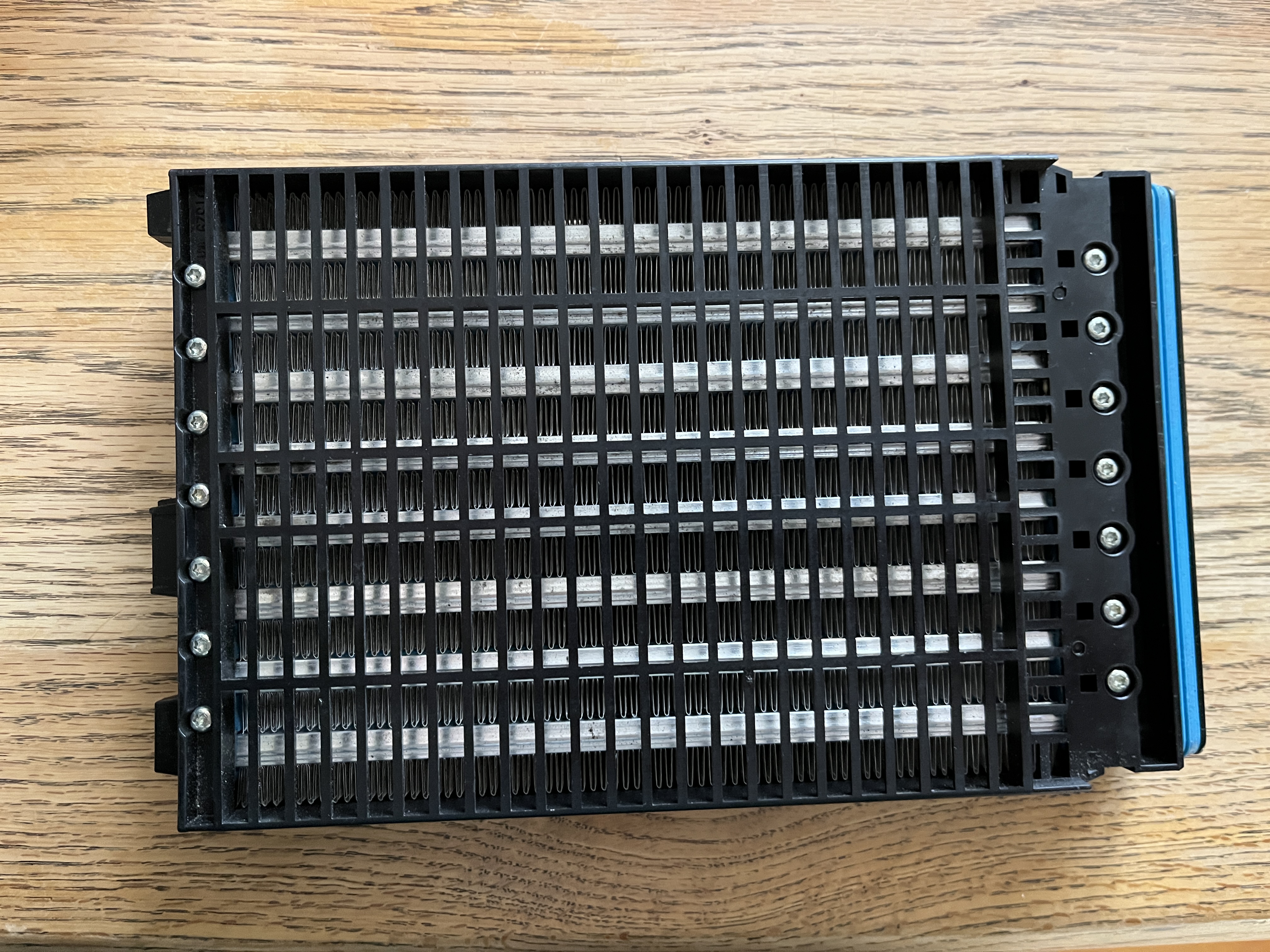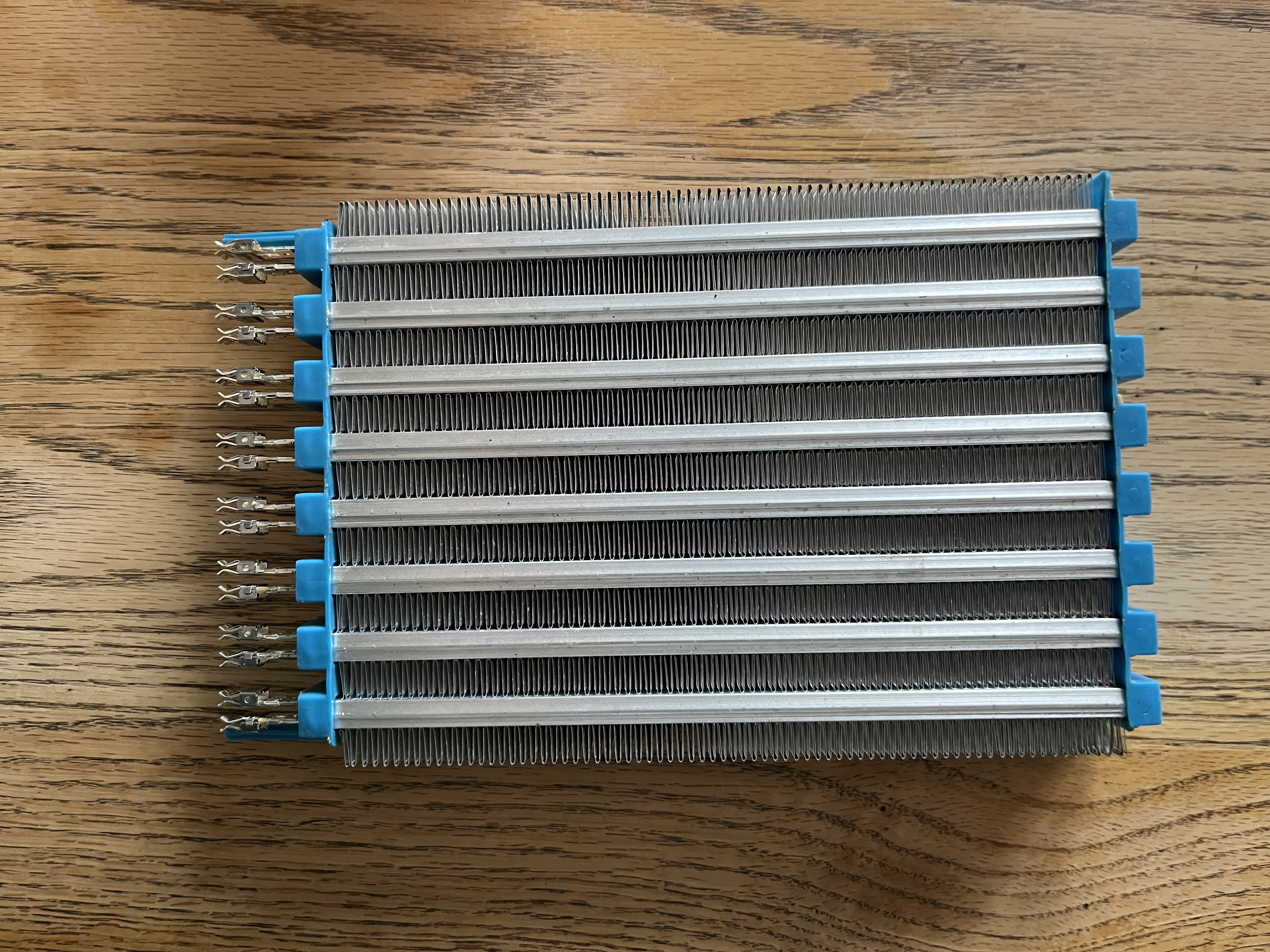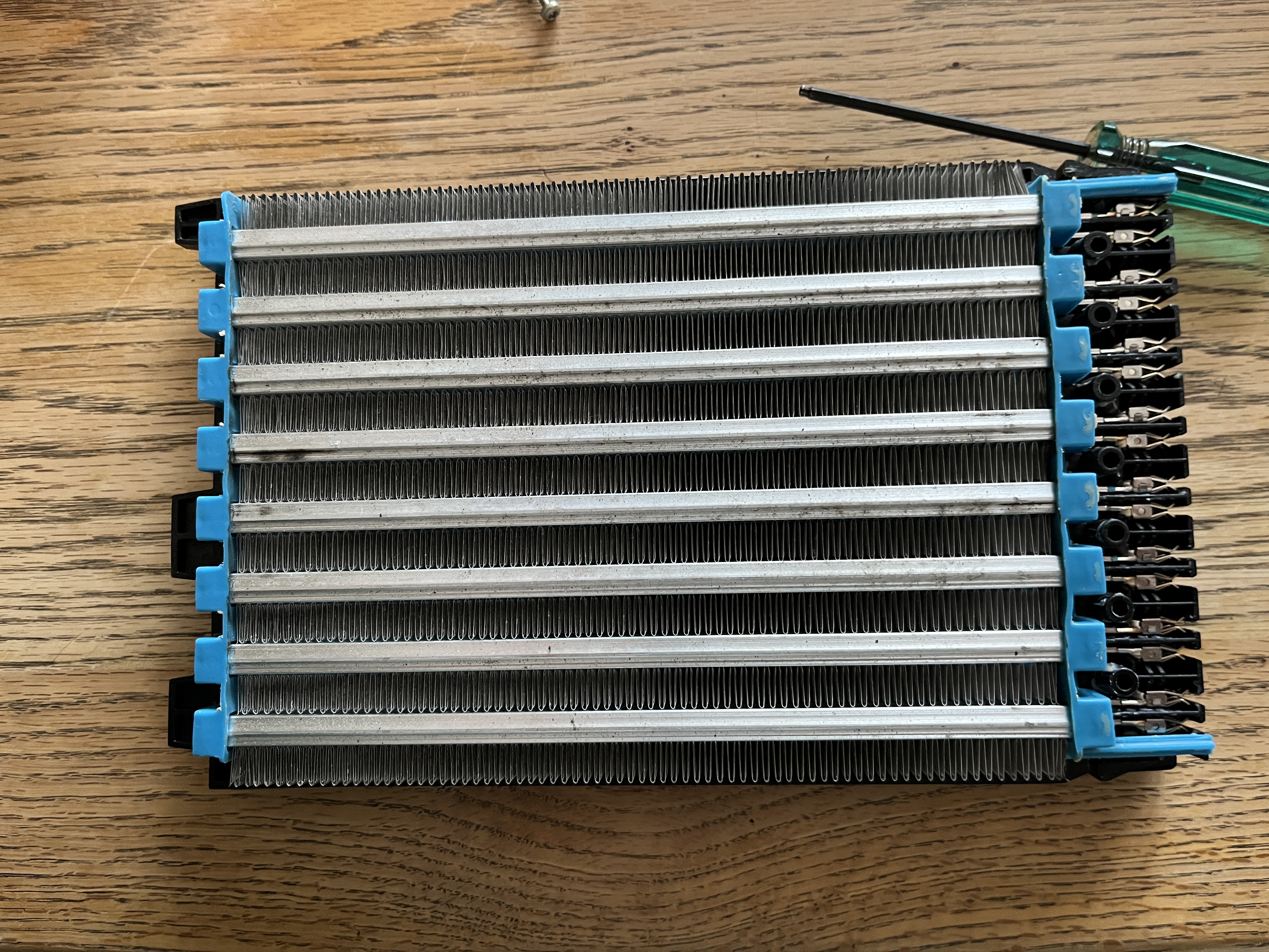 Before i bought anything i checked if the heater was one single core or multiple cores stuck together. Turns out it is made of 8 cores! They measure 600 Ohm across each. They have fast-on-esque tab connections to the OEM controller which is easily removed. I didn't know it came off easily so i tried hacking it off first). Each heating element is a simple strip of resistive material sandwiched to an aluminum plate and fins thru a (assumed) thermally-conductive-electrically-insulating gap pad.