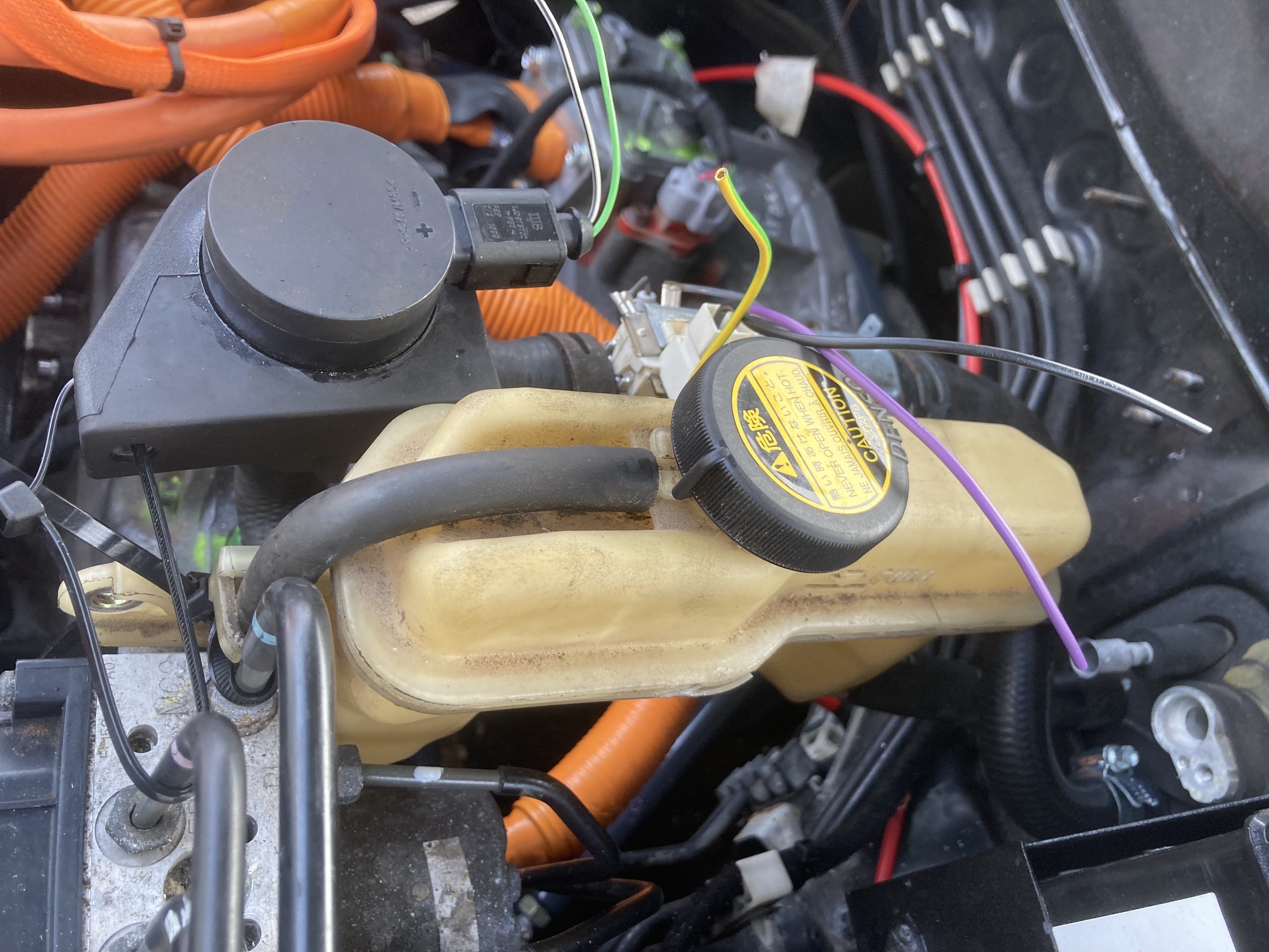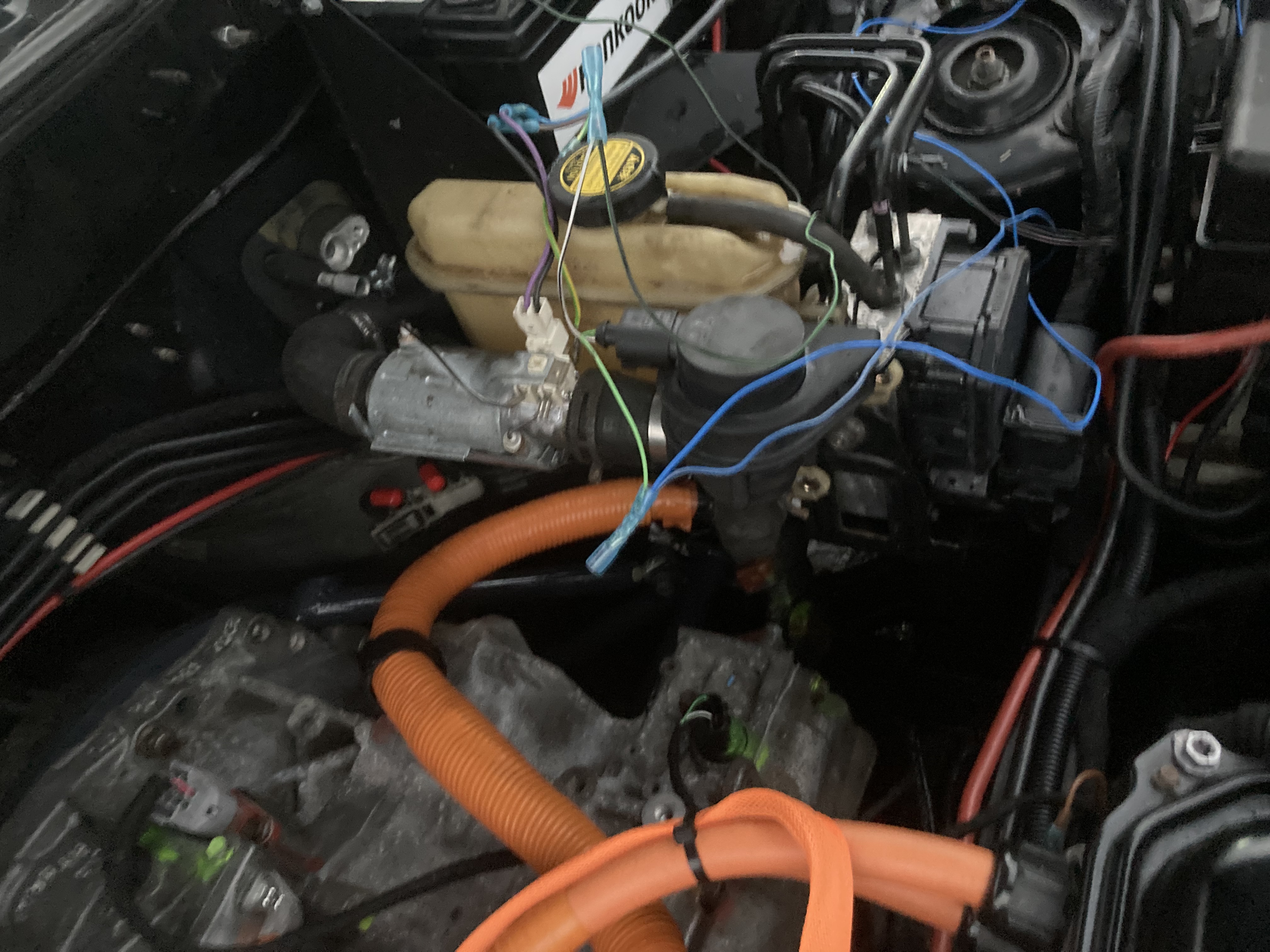 Please excuse the crudeness this is currently just wired to a 240v plug as I have been putting the car on charge for an hr before leaving in the morning to warm the batteries a bit, so I will just plug this in at the same time to dry and pre warm the cabin, mid term I will wiring the dishwasher heater into the battery, repurpose the thermoswitch to turn a contactor on and off, and maybe try and put a box around it and mount it better than zip tied to the abs pump!
