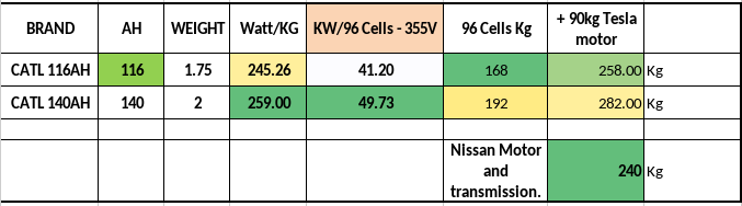 I decided that I just want to install the batteries in the front of the car. Because of that I cannot go with LiFePO4 and I need to go with NMC 3.7V cells. that will be 168Kg.