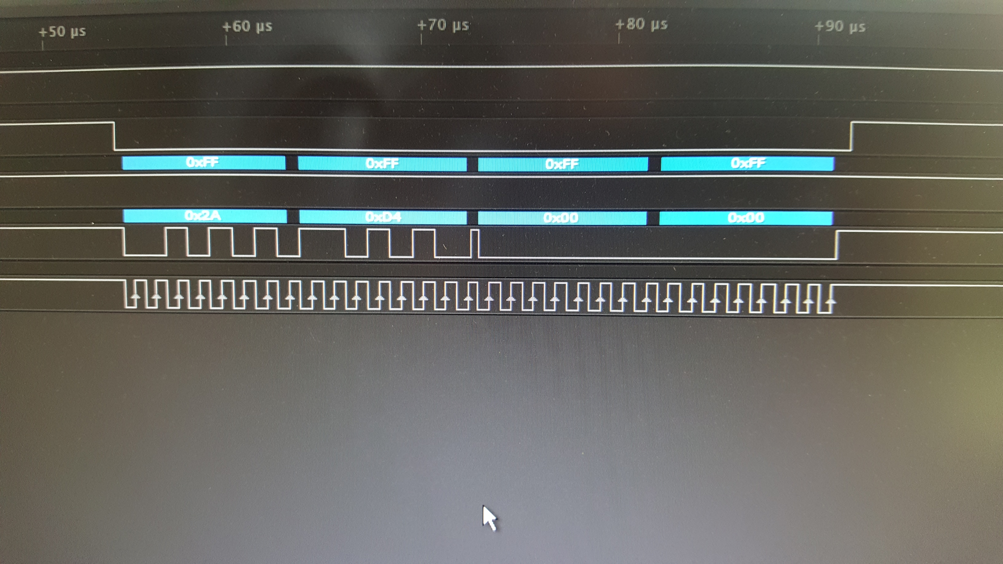 Attached capture from Salae logic analyser. Can be viewed with free software : https://www.saleae.com/downloads/