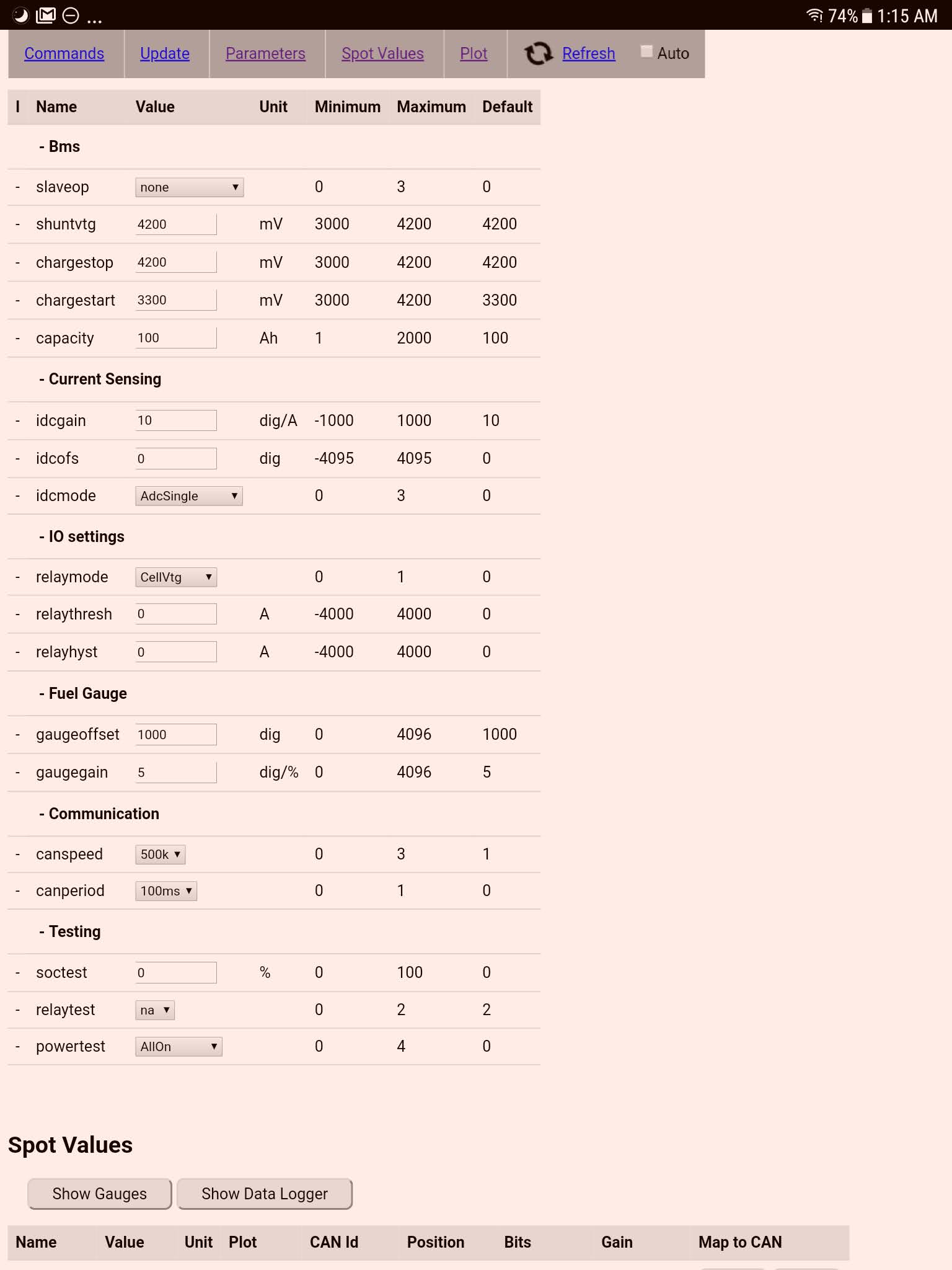 It seems to work however I do not see any values from BMS reported in the "Spot Values" section on WiFi interface, all values show '0'