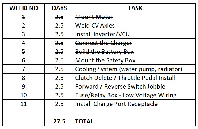 slightly revised schedule for the purpose of steadfast driveability with some built in padding for nice to have little things like: brakes and seats which I will do off camera on this forum anyway, the Flintstone floors will be delt with later... much later