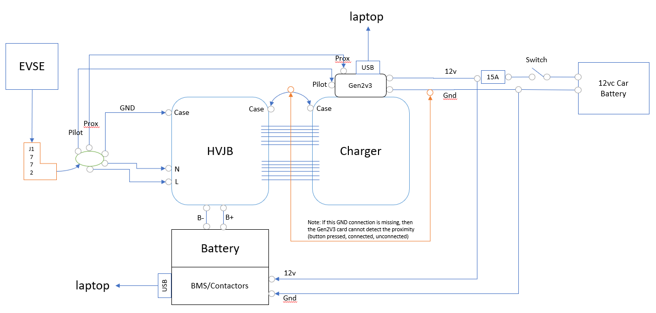 The odd need for a ground connection between the charger/HVJB cases (grounded to the EVSE) and the GND from the car battery is still necessary for the Gen2V3 card to be able to tell if the EVSE button is pressed, connected, or unconnected. When that ground is missing - the Gen2V3 card oscillates from Pressed to Connected. I suspect that the GND connection from the EVSE is connected to the Model S grounds just after the charge port. So while this looks like an odd ground connection in my setup, it is normal for the Model S (EVSE ground connects to car's body ground rather than to the HVJB case).
