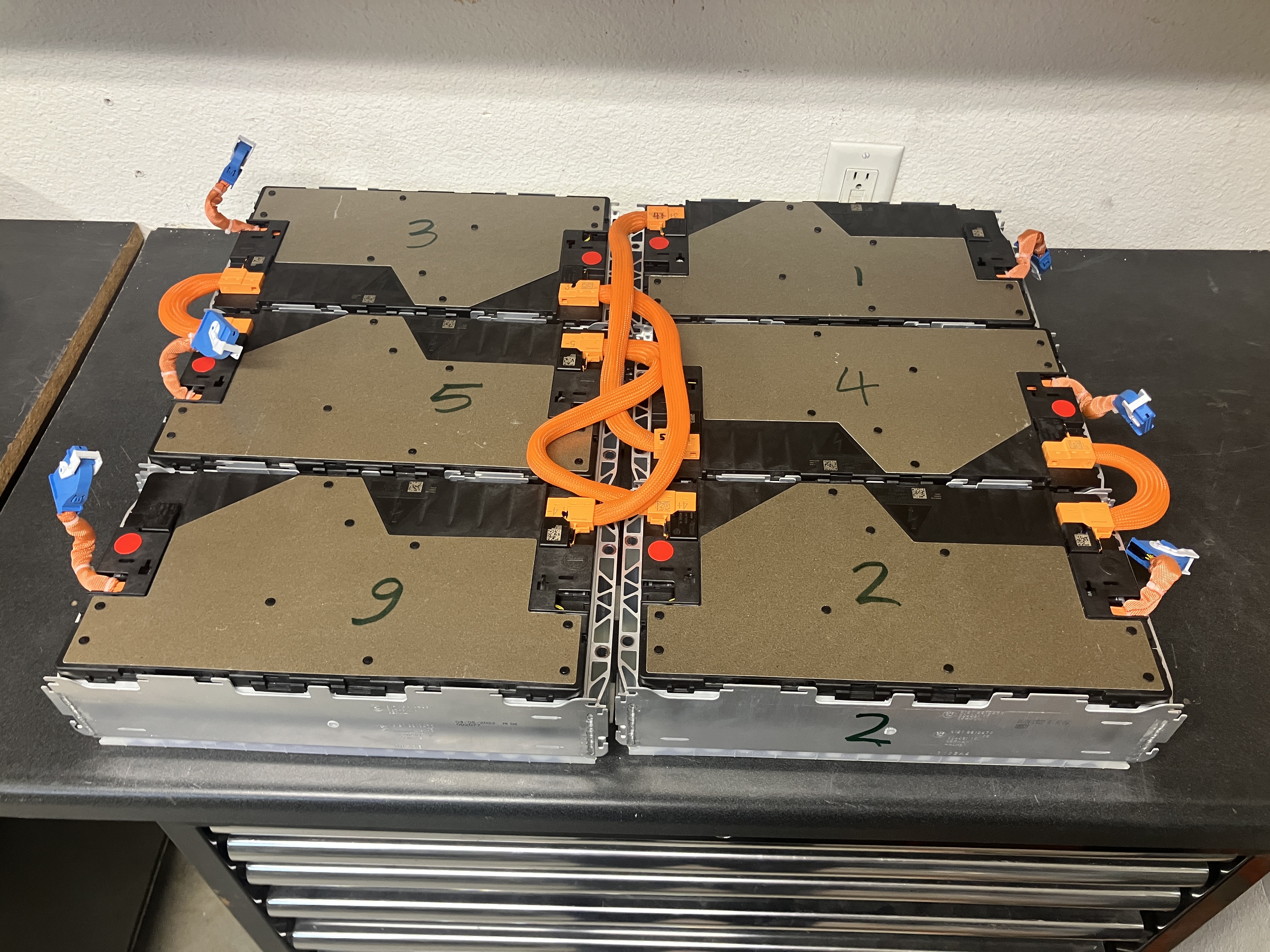 (please note how the orange cables stick out beyond the borders of the battery pack, keep that in mind when constructing your battery boxes, you must allow some room all the way around the perimeter for cabling, and not perfectly hug the modules, this is something I always think of when folks tell me these modules need to hug one another or be sandwiched tight between battery box walls to prevent expansion/bulging etc.)