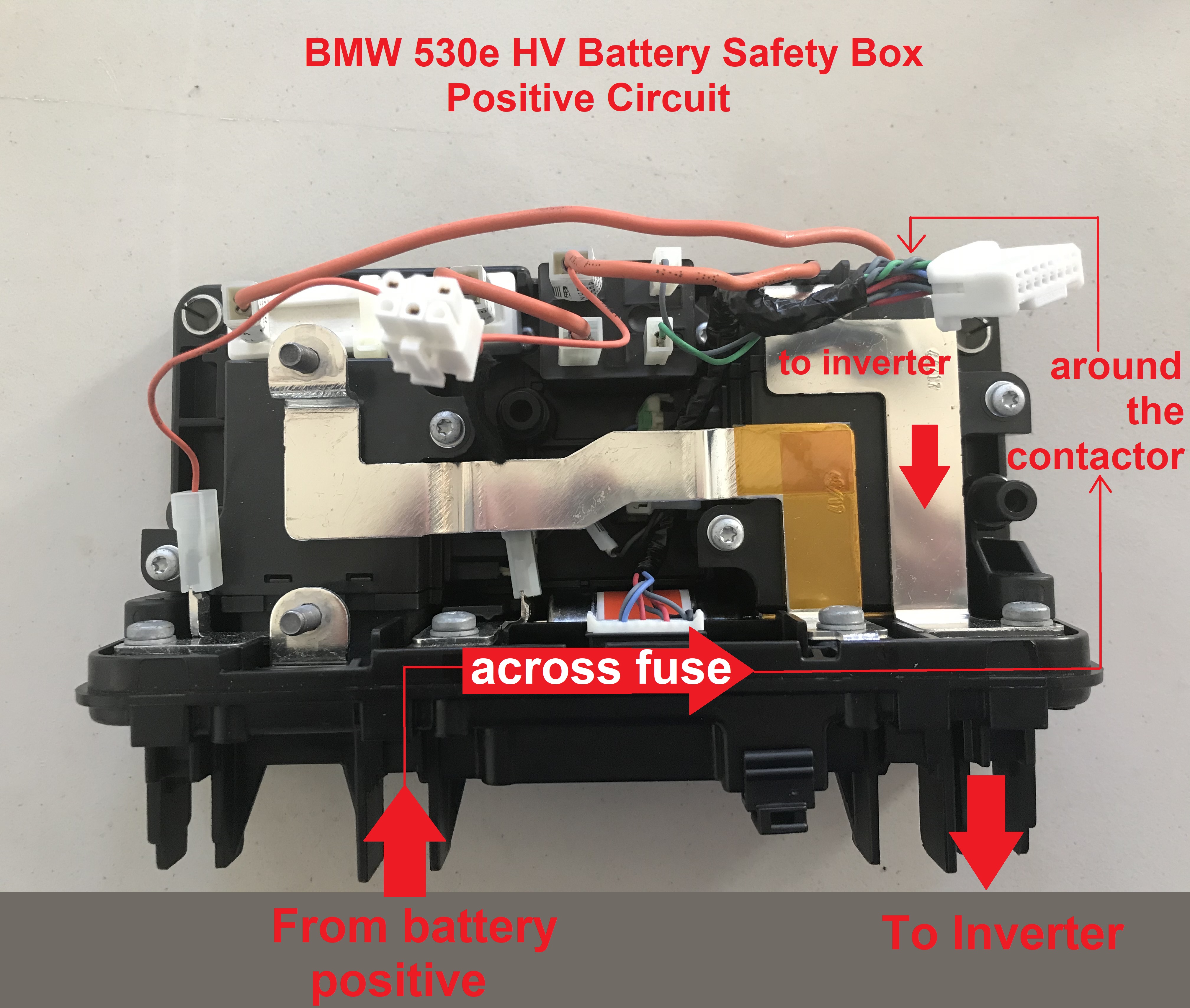 Note: on the positve lead we have a 350 amp 450 volt fuse, BMW used the same fuse on both the Gen 1 (9 kWh) and Gen 2 (12 kWh) battery packs