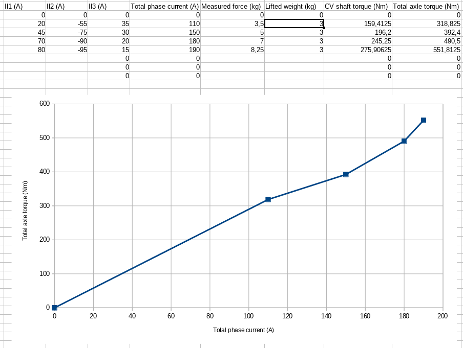 Anyway, this is what I got so far. The current is simply throtcur*potnom. I haven't checked whether the inverter is reading correct current values compared to a clamp meter so you should assume it's probably wrong. On the other hand, I'm assuming the force measurements and calculated torques are somewhat accurate. Probably a good idea for me to check Iq and Id also, the inverter shouldn't be using much Id in this case.
