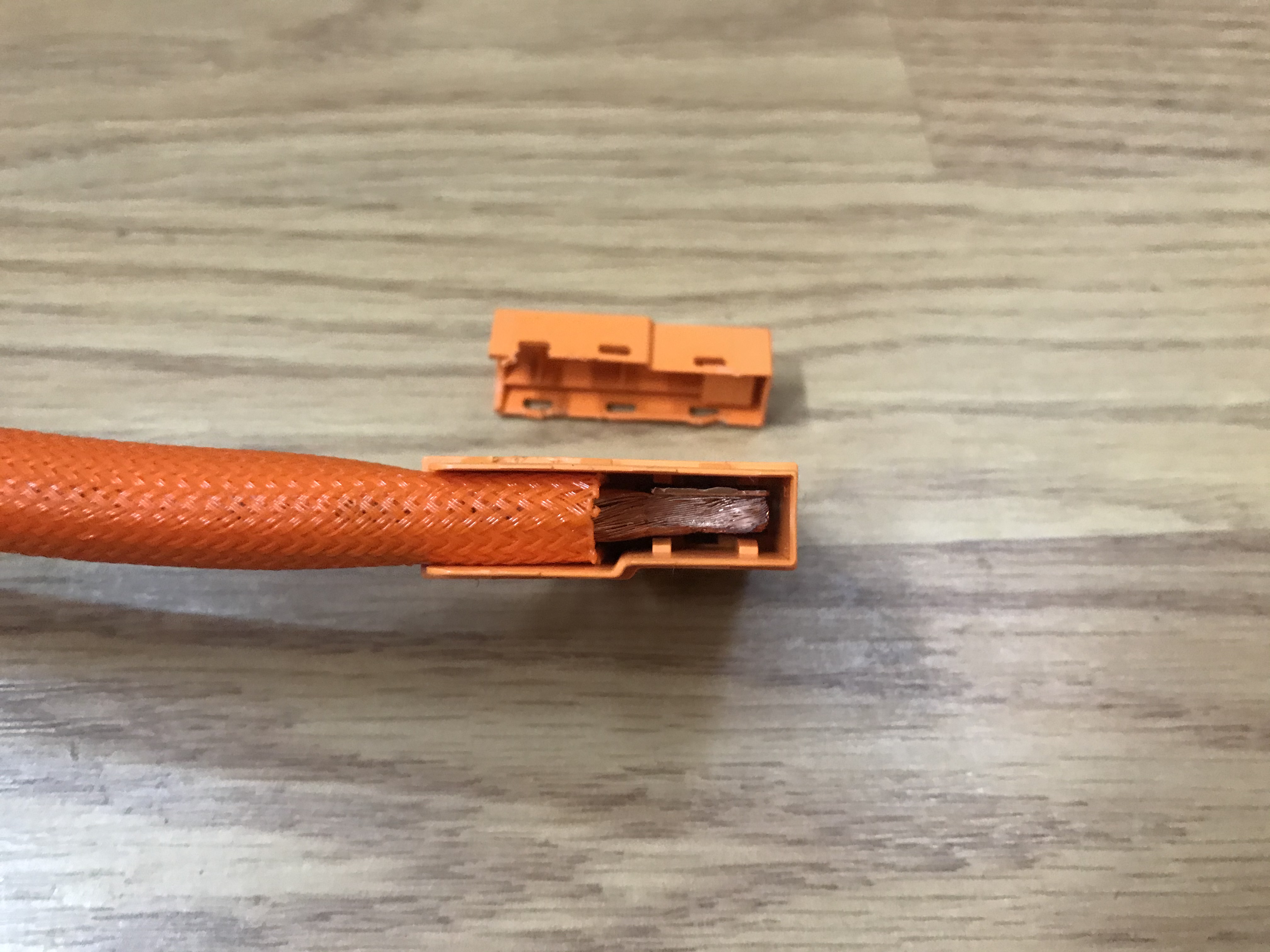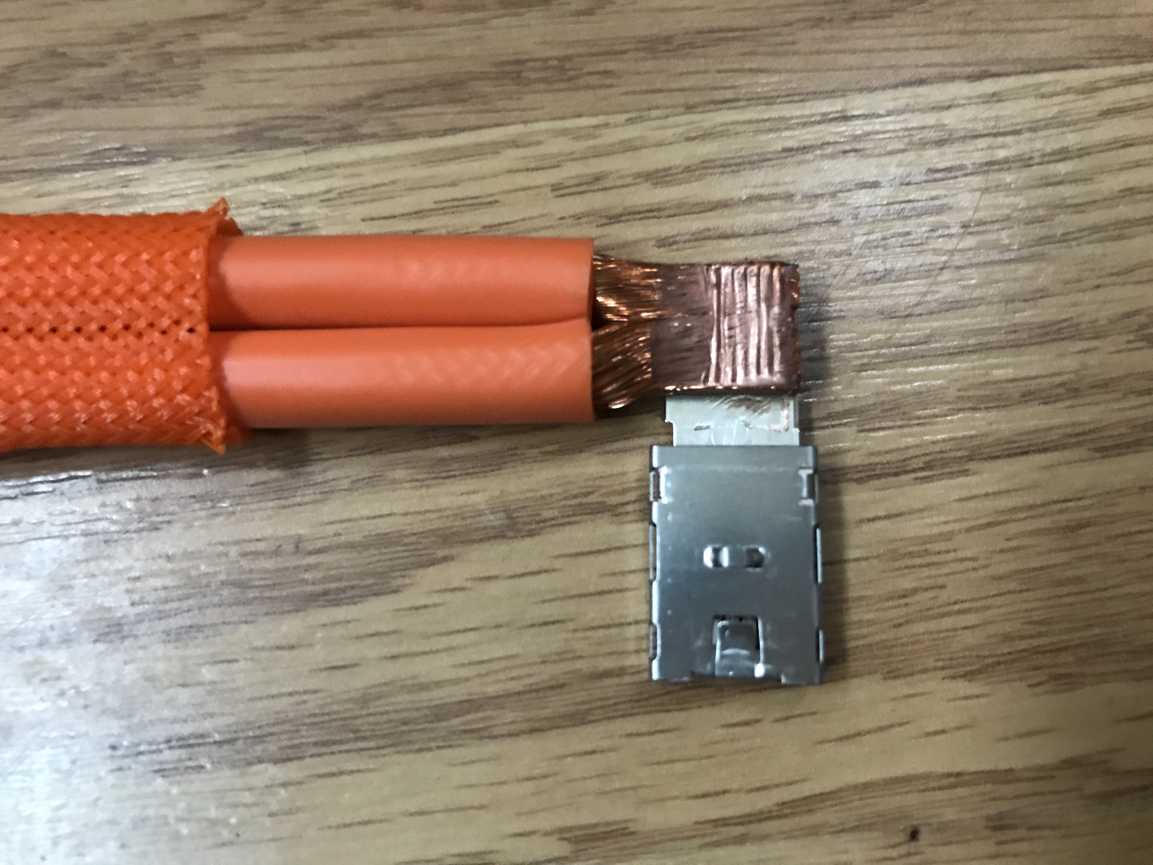 I decided to pop one open to see how it was built, since I could feel that there were really two wires side by side in that orange mesh housing