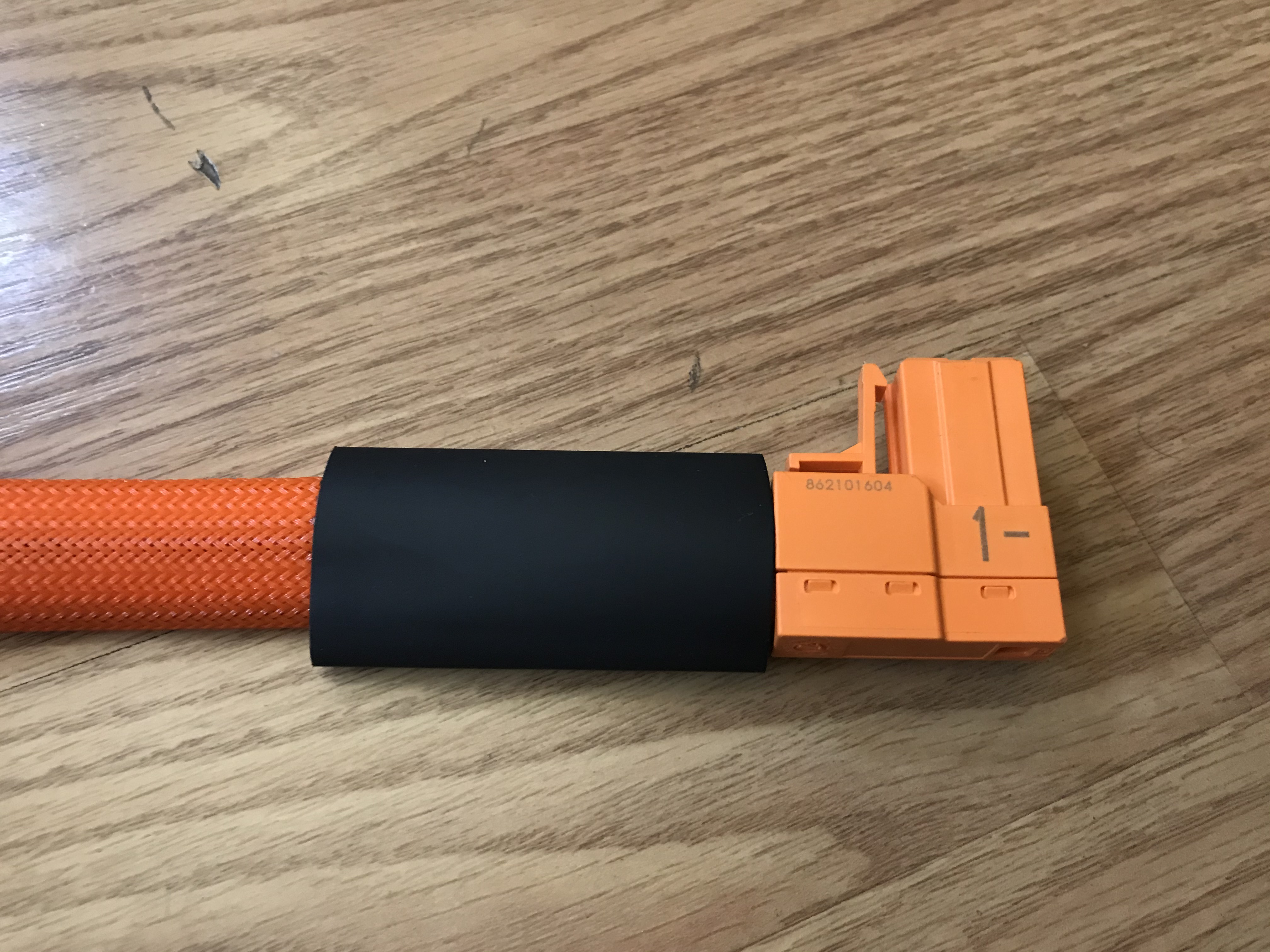 I decided to add a little color coding to the two solid orange main leads, first some black heat shrink tubing went on both ends of the negative cable