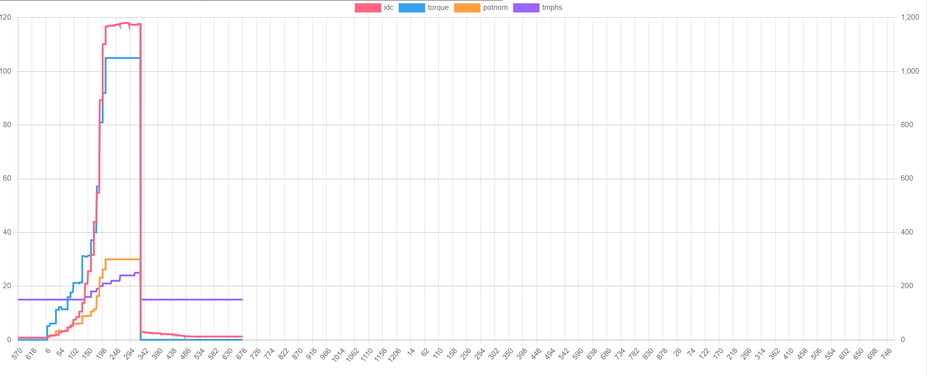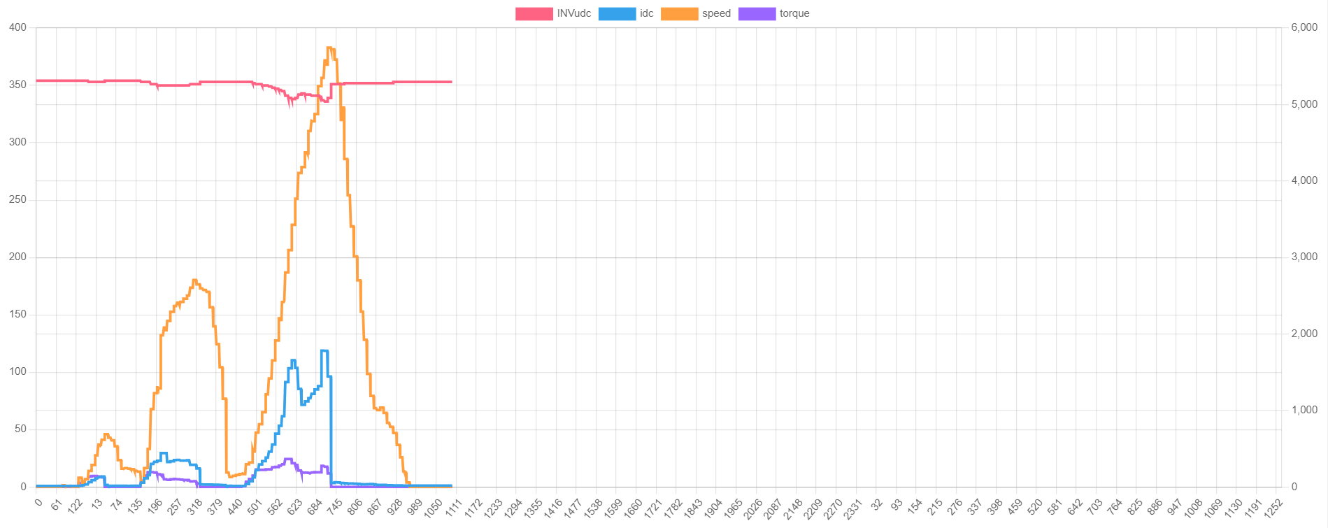 so anyway I have no idea what to make of most of this but the cut is still there. I've taken the inv volts and speed out of the later plots as they dont seem to be connected to the cuts also no matter how hard you push it current does not exceed about 120A