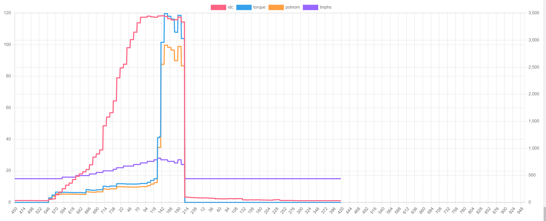 The vast discrepancy of torque actually being generated/power draw vs the "commanded" torque is crazy. 'Potnom of 25% yields roughly a 800 torque request which can yield the max draw of 110A.