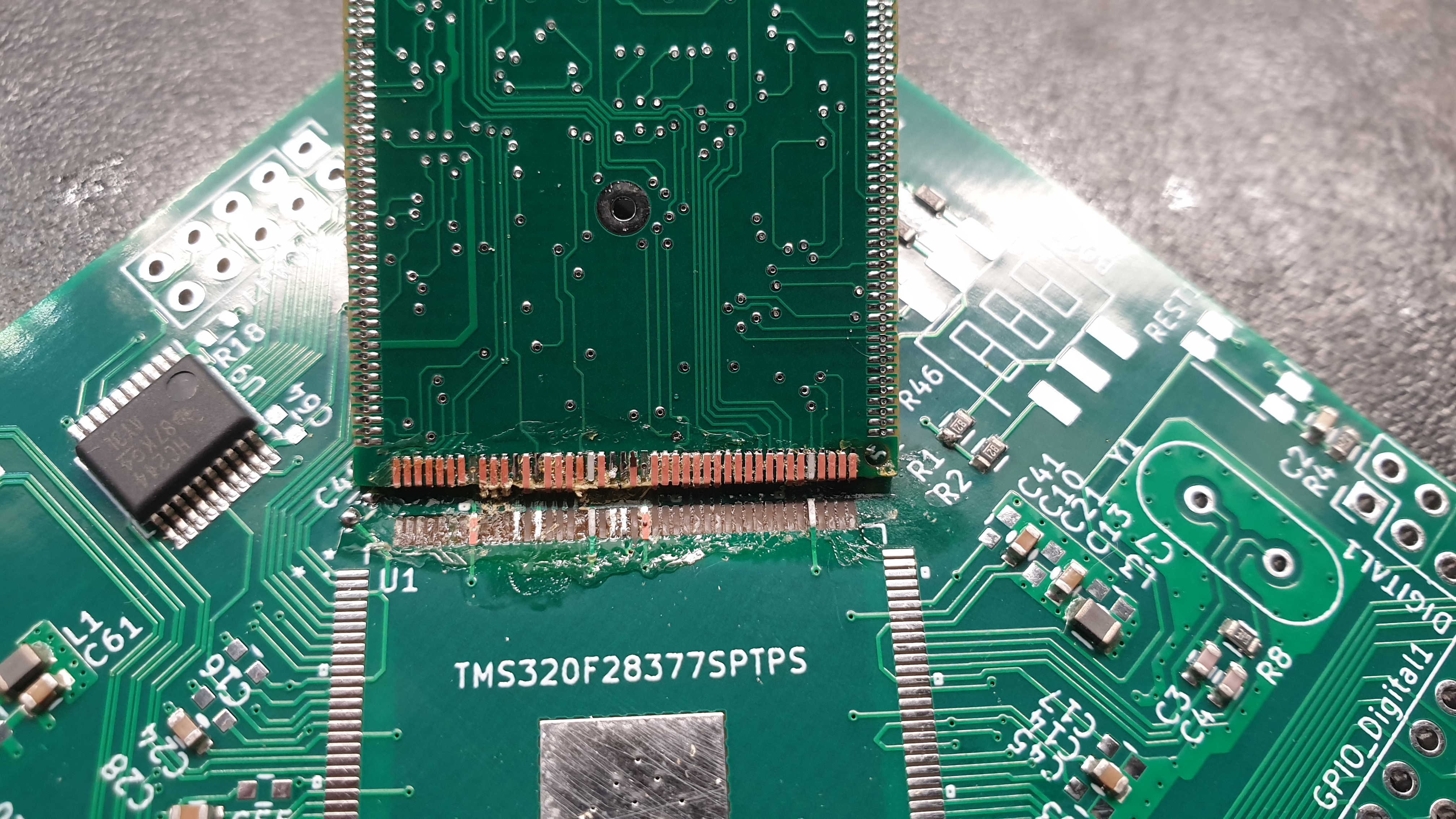 In other news began testing of the new modboard on a demo board with the 28377 footprint. Bad news first, its a little too small. I need to move out the pads about 1 to 1.5mm so the holes hit more of the "motherboard" pad surface. Good news : Once centered and drag soldered the joints are near perfect and rip the pads off when forced and don't bridge over. So we need some more refinement but the basic idea seems to be sound.