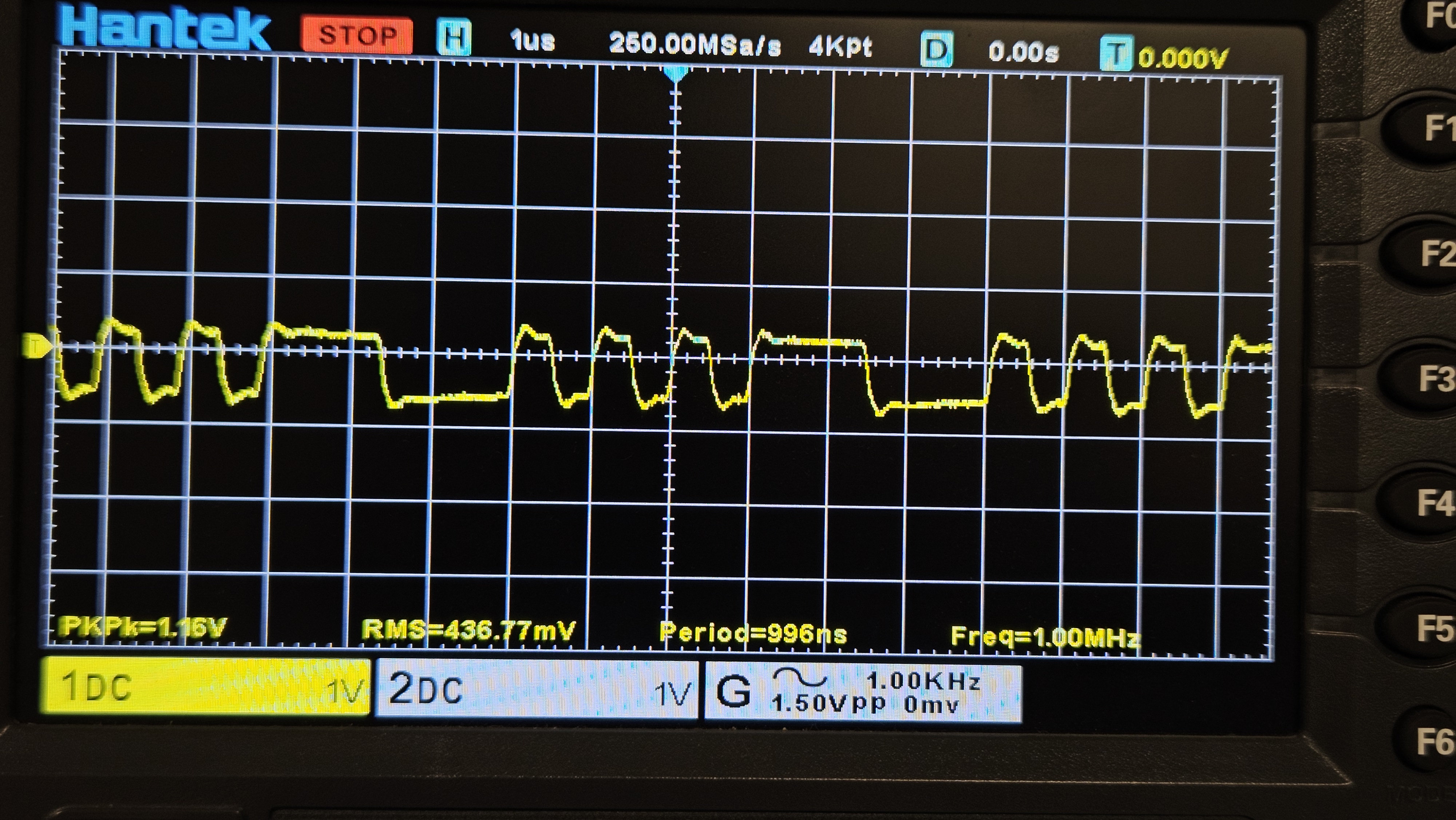 Image 2 (slave side): Couldn't connect GND clip of probe to the wire. I used math function and did CH1 (RXP) - CH2 (RXN). That is the purple line you see on the scope with scale on 2V. Max ampl. 4V