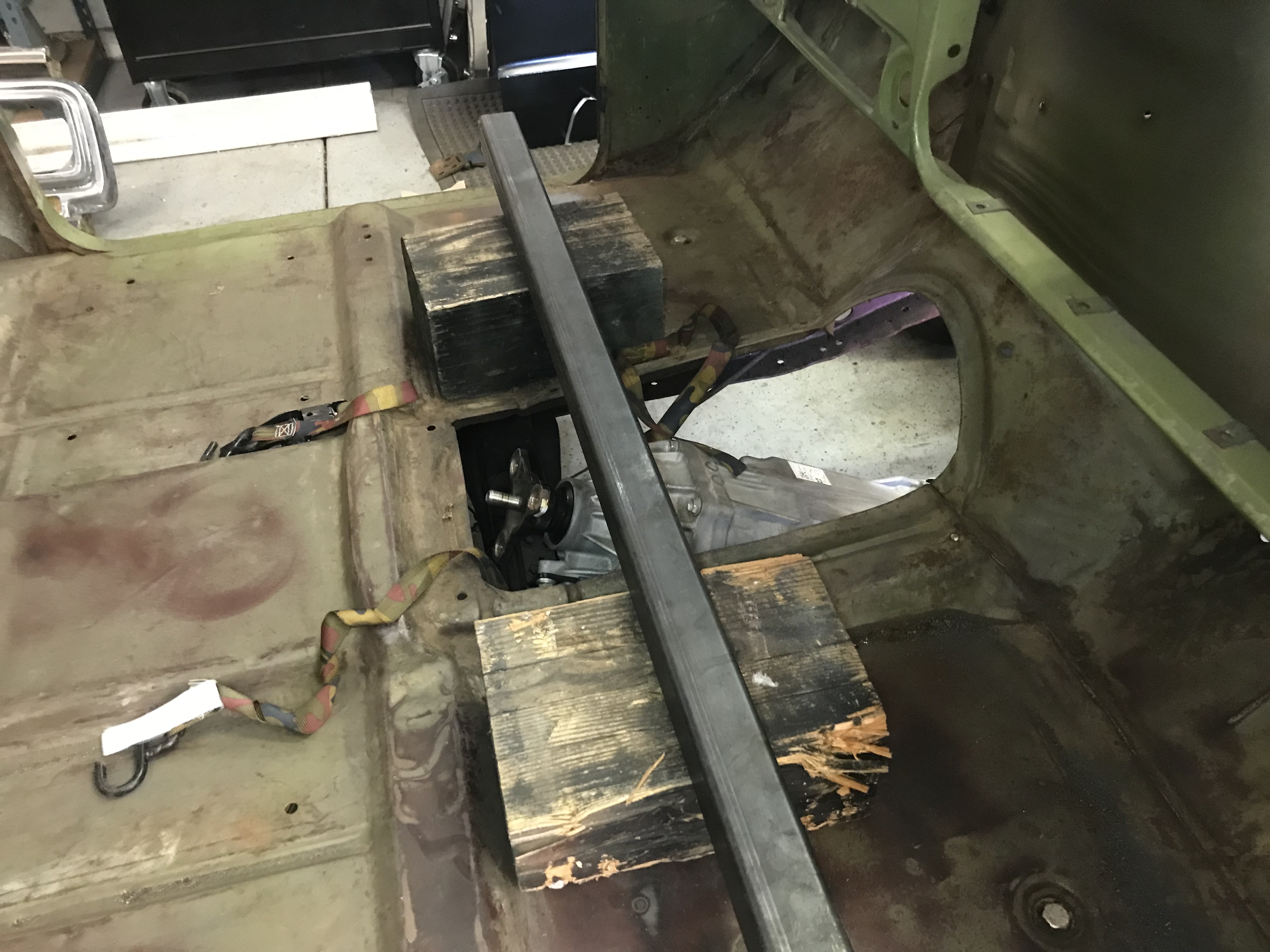 this was my first attempt with the stock transmission crossmember, it just makes the tail end sit too high, so out it came
