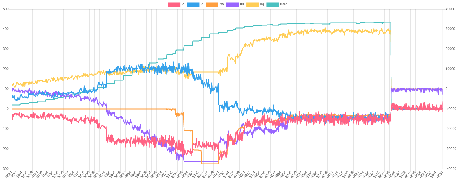Been wondering about this, is it possible that on some motors the -Id added by Mtpa is enough to do fw while on the accelerator? If so you would only see FW come in during coasting or deceleration above base frew and I don't see much of that in the plot. It would be interesting to see the Uq and Ud voltages on the plot too as that would show whether Ifw should have been added.