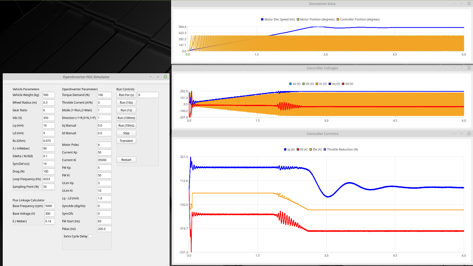 Unfortunately while using the simulator I've become fairly convinced that there is still a control stability issue when pushing further into the FW region of motor speed. From what I've seen in simulation it's could also be a very rapid transition from working fine to strong unexpected regen and the further you push past base frequency the stronger the regen gets. I'm hoping I'm wrong here, that the simulator isn't accurately modelling things, that the instability isn't there and it all works fine at high speed, the trouble is the only way to tell is to accelerate to high speed in a car and if the problem is there, and exhibits itself at high speed, it could get nasty. While I'm willing to take a chance while I'm driving I need to be 100% confident when it's someone else.