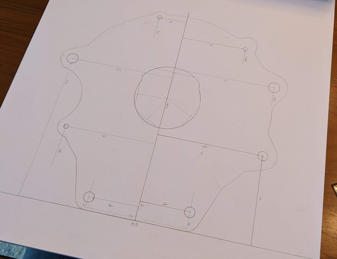The transmission PDF I used to model one of my adapter plates was probably for a RWD VW and so though it looked correct, it was not. Without being able to find any drawings, or CAD online i resorted to making my own. fortunately i have too many 4cyl VW engines sitting around my garage so i was able to trace a dust shield to get my profile.