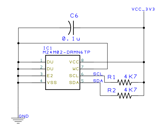 What's the EEPROM actually connected to? SCL and SDA are connected to the CPU with a 4.7kOhm pull-up to 3.3V?