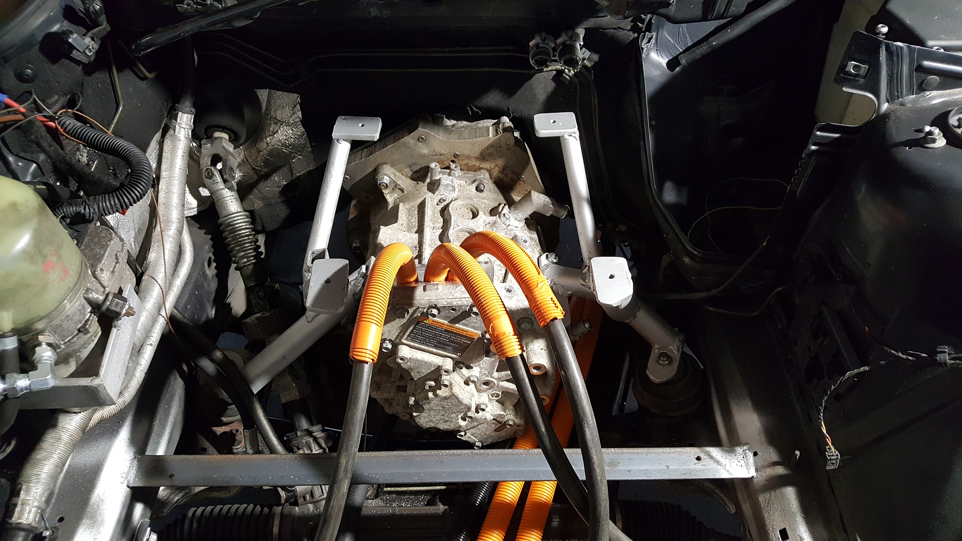 Motor mounts sanded and painted. Inverter mounts done. Power steering pump mounted and high pressure line in. All hail the Grey Goose
