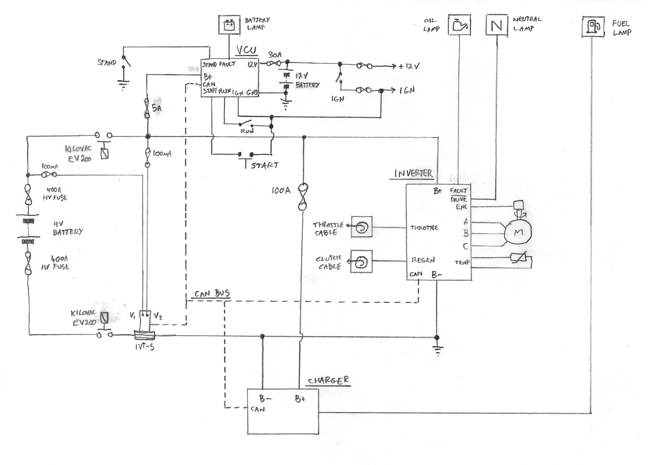 The "VCU" will also have outputs for the temperature gauge & remaining range display (not shown). The basic idea is to preserve as much as possible of the original bike "user interface" i.e. retaining the meaning and purpose of the original switchgear & indicator lights. It is likely that all the indicator lights will be handled by the VCU (via CAN), rather than coming directly from the inverter & charger (as shown in my diagram).