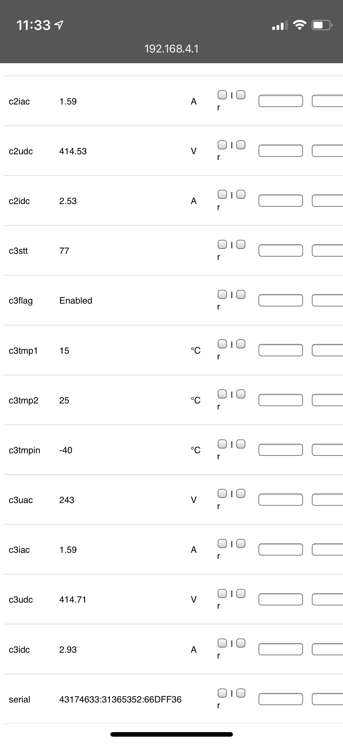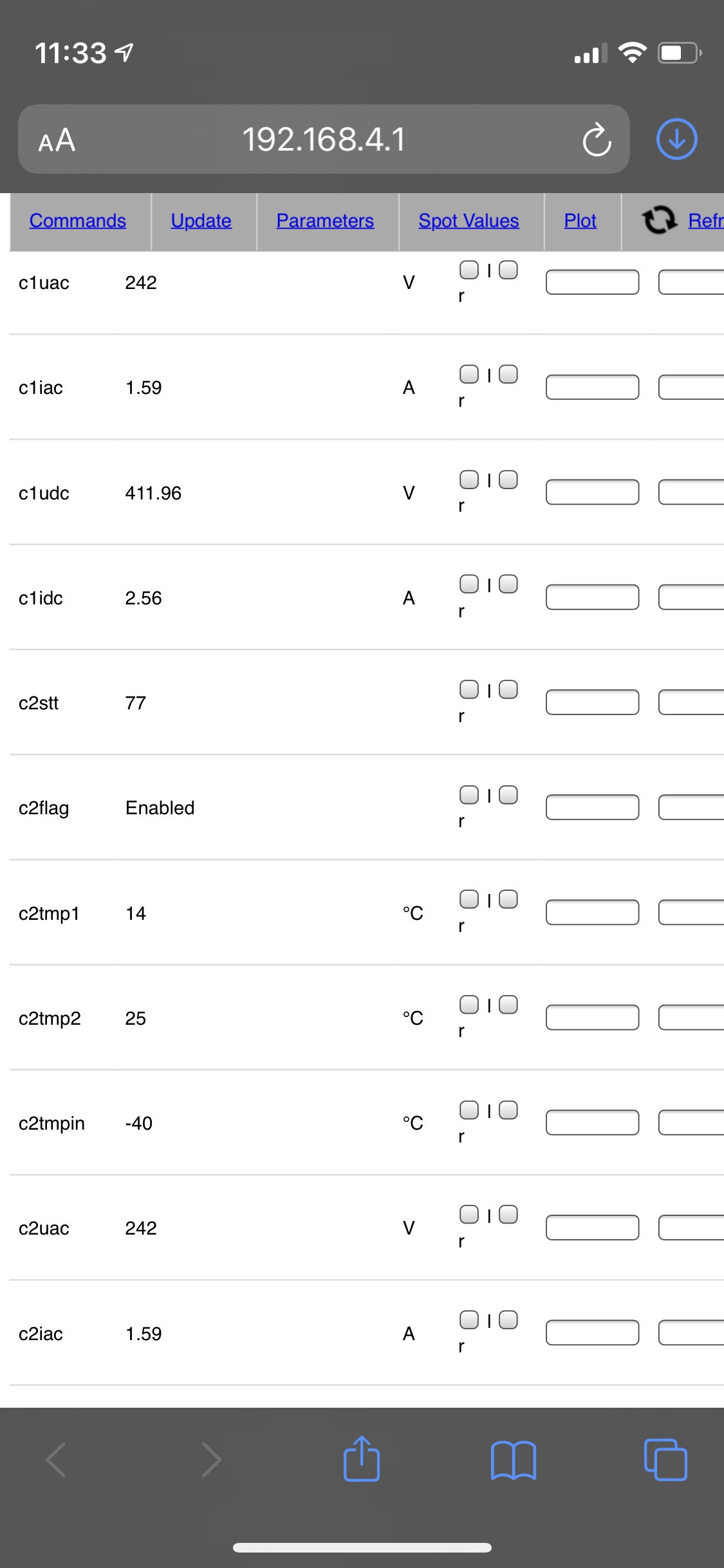 No luck today. Updated the wifi module and have the interface showing. Updated the bootloader and charger file but no parameters coming through on the interface. Need to dig in further tomorrow.