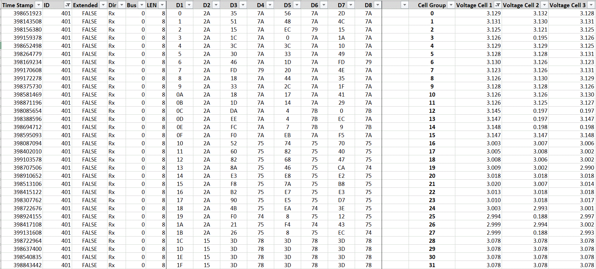 fredd90, what way did you pull out the cell voltages and pack voltage, had you a script or manually? Use 0x401?