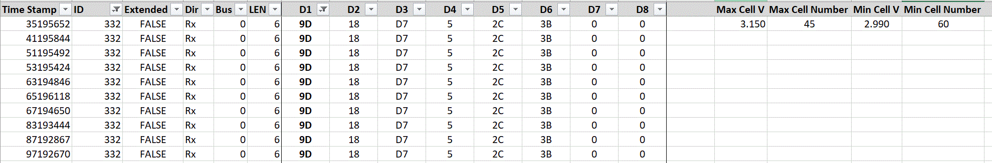 On the Vehicle CAN bus then, reading 0x332 I get below output for min and max cell voltages and cell numbers (same result Collin was able to read from my csv files earlier in this thread), and this shows a mismatch in results: