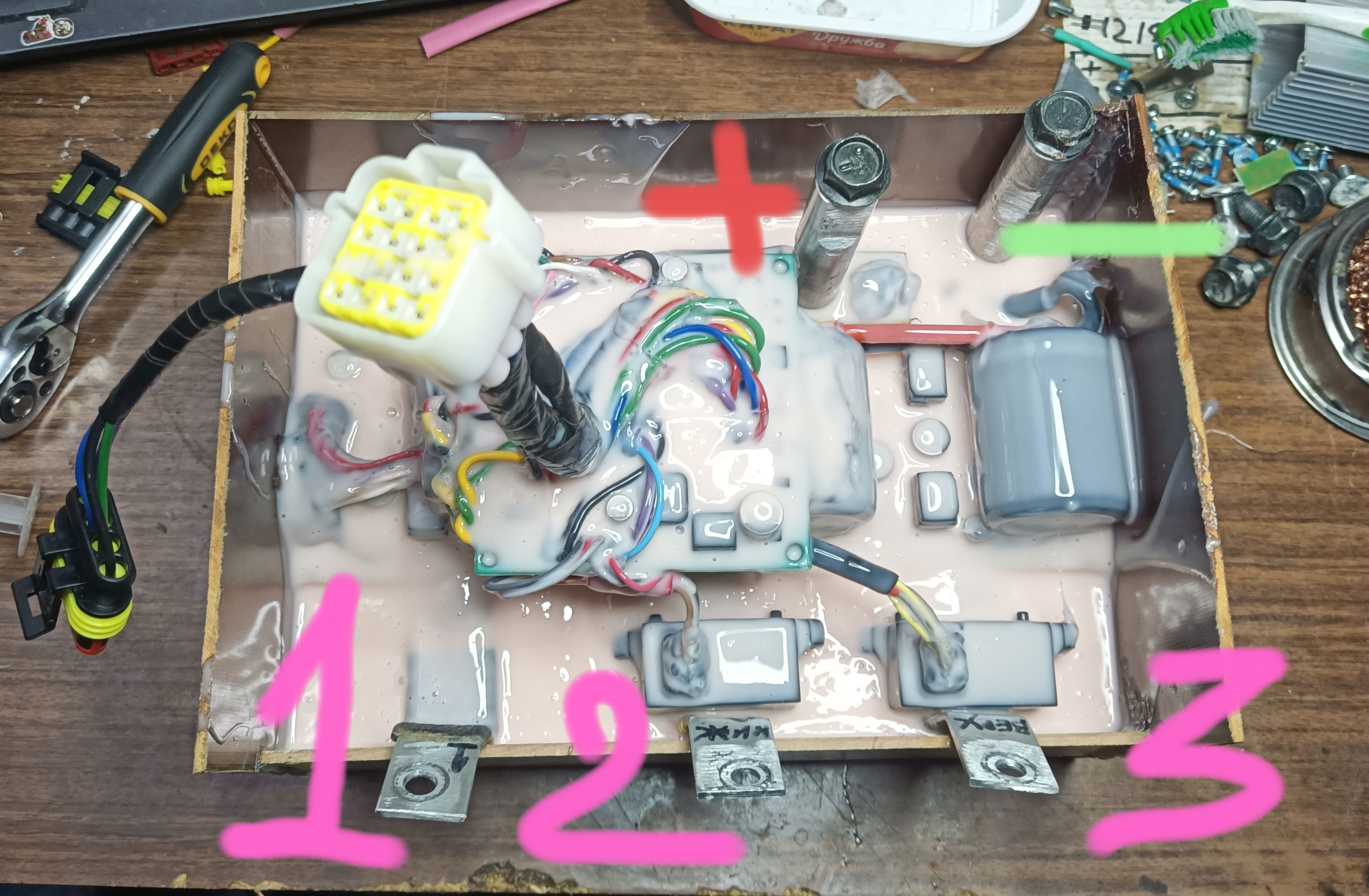 I slightly filled the whole thing with silicone, and this repeatedly saved me from accidental short circuits with small objects that fall anywhere in the car. I'll make him a more decent case later.