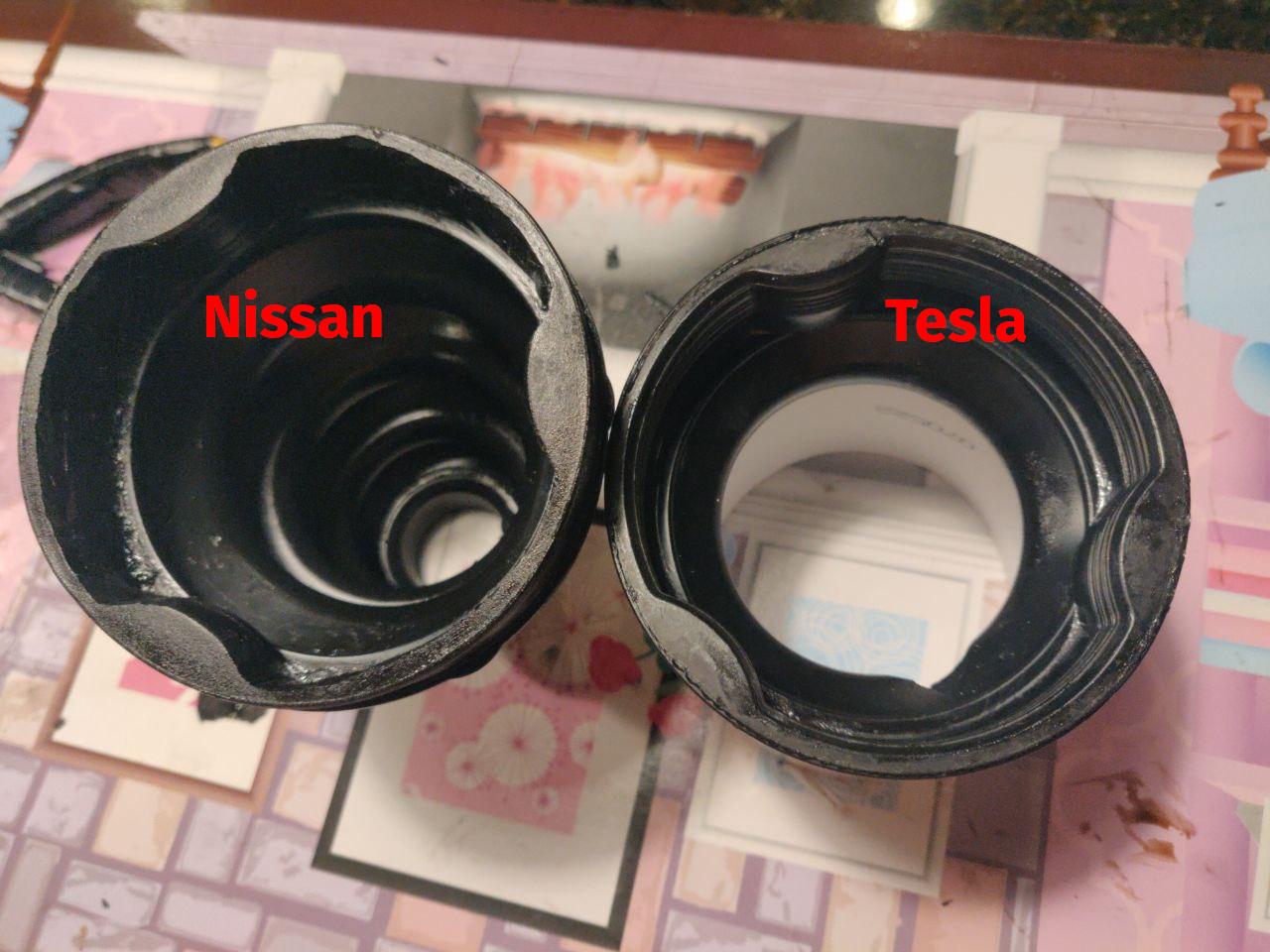 Since your tesla axle is made custom maybe you can find the Nissan donor part somewhere and measure it up.