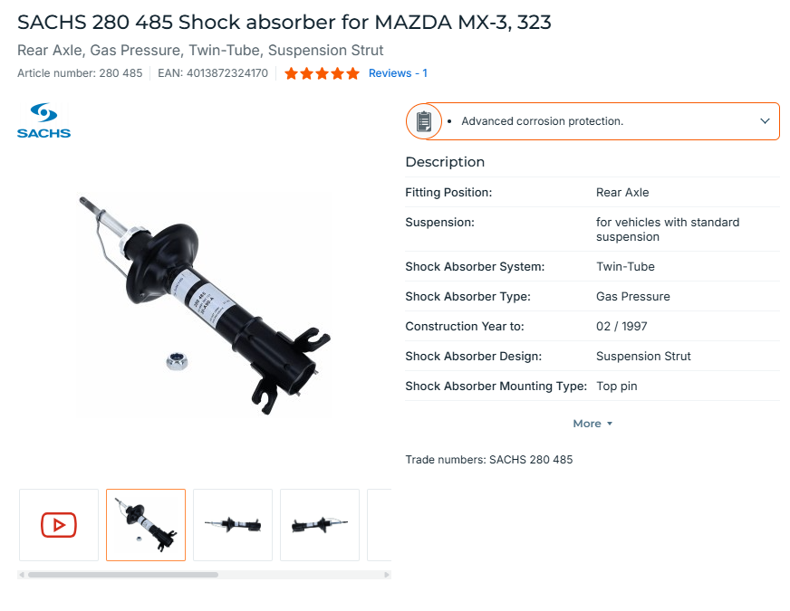 I ordered shocks and top caps from Autodoc, SACHS 280 485 Shock absorber for MAZDA MX-3