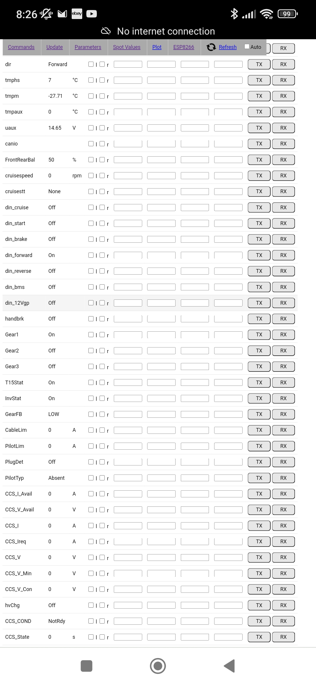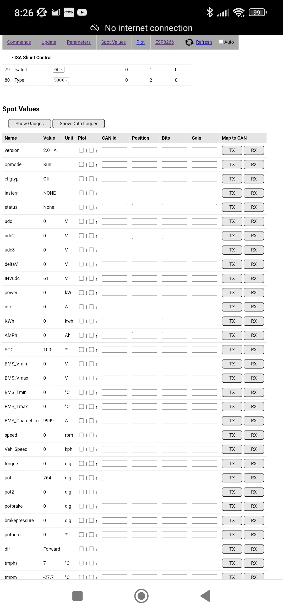 Output spins freely and gear selector in Drive.nkiernan wrote: ↑Fri Dec 08, 2023 7:54 am Is the actual gearbox gear selector in a neutral position (R-N-D) and not in park position so output is free to rotate? In spot values, I presume OpMode is showing as Run, but is Brake showing as Off and either Forward or Reverse showing as On when you're applying throttle to spin? Is LastErr or Status below it in spot values showing any message?
