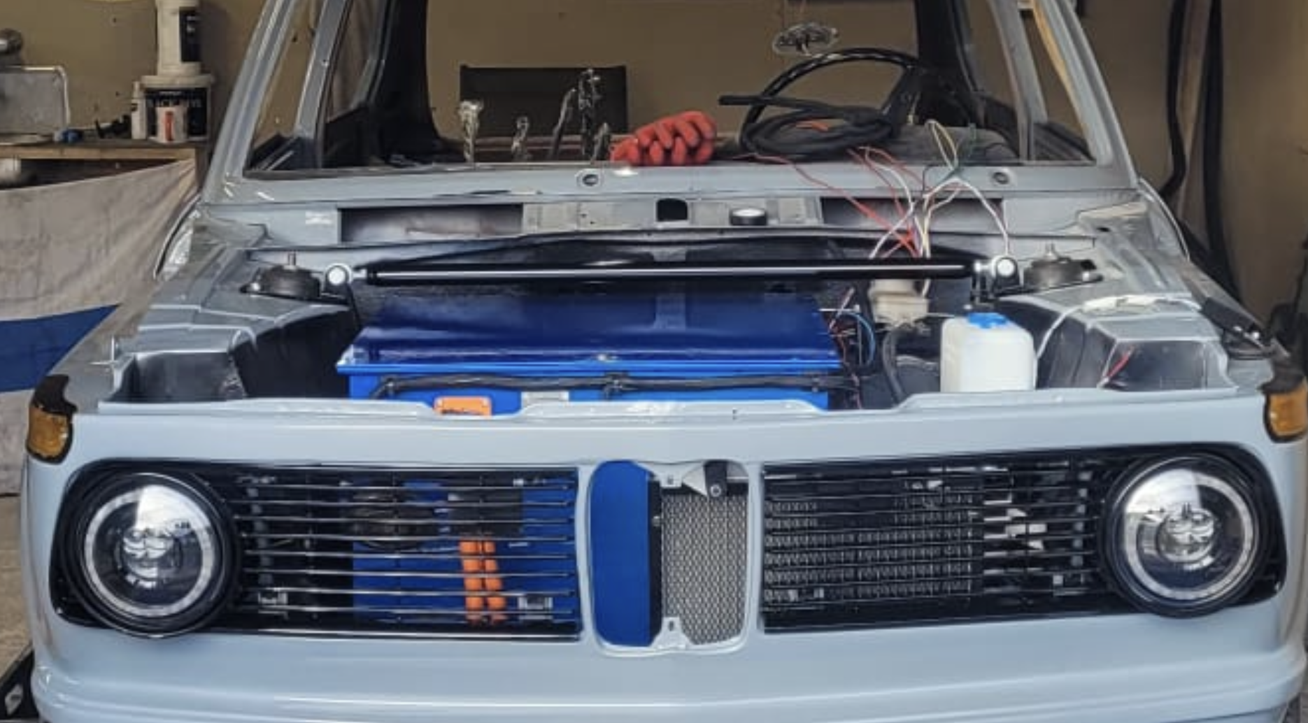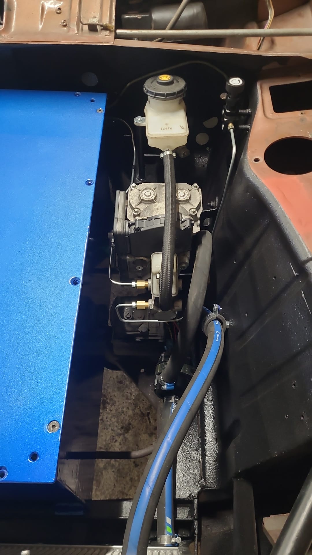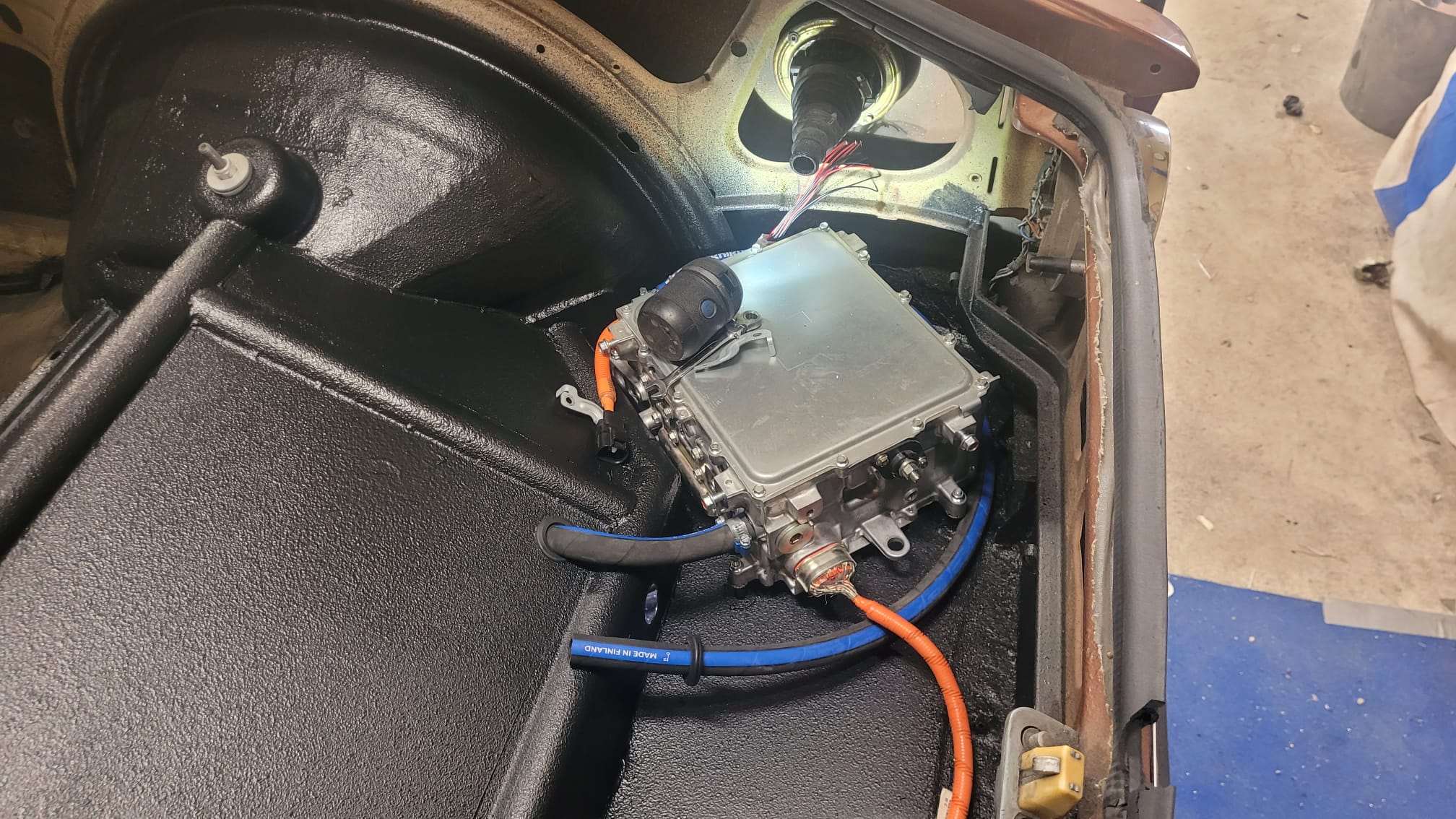 Progress update. New trunk floor with outlander charger and 12V battery in place. Motor mounts done and cooling. Radiator, pump and hoses done. Batterybox almost done and painted, just missing data cable connector. Remote reservoir for iBooster. Brake balance/proportioning valve installed for rear drums as well as new brake lines. Testing out e-ink display for showing state of charge, range and other things. Bought VW Golf mk3 GTI seats to replace those big sofas. 3d-printed plastic rollers to rear trunk lid shock arms. Epoxy + raptor paint for new metal parts. Front struts modified to have level adjustability. New coils to front.