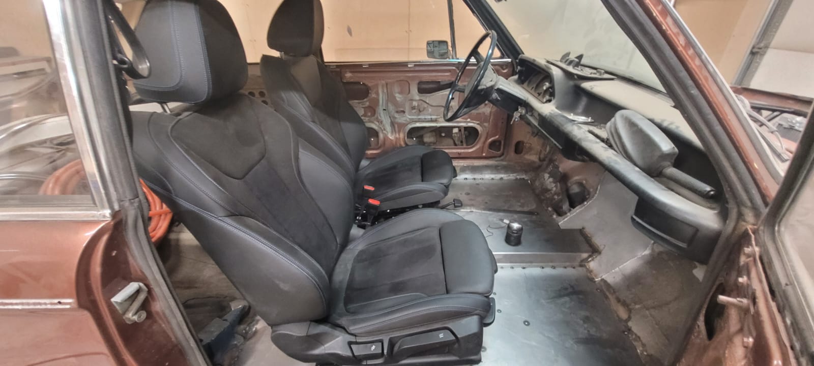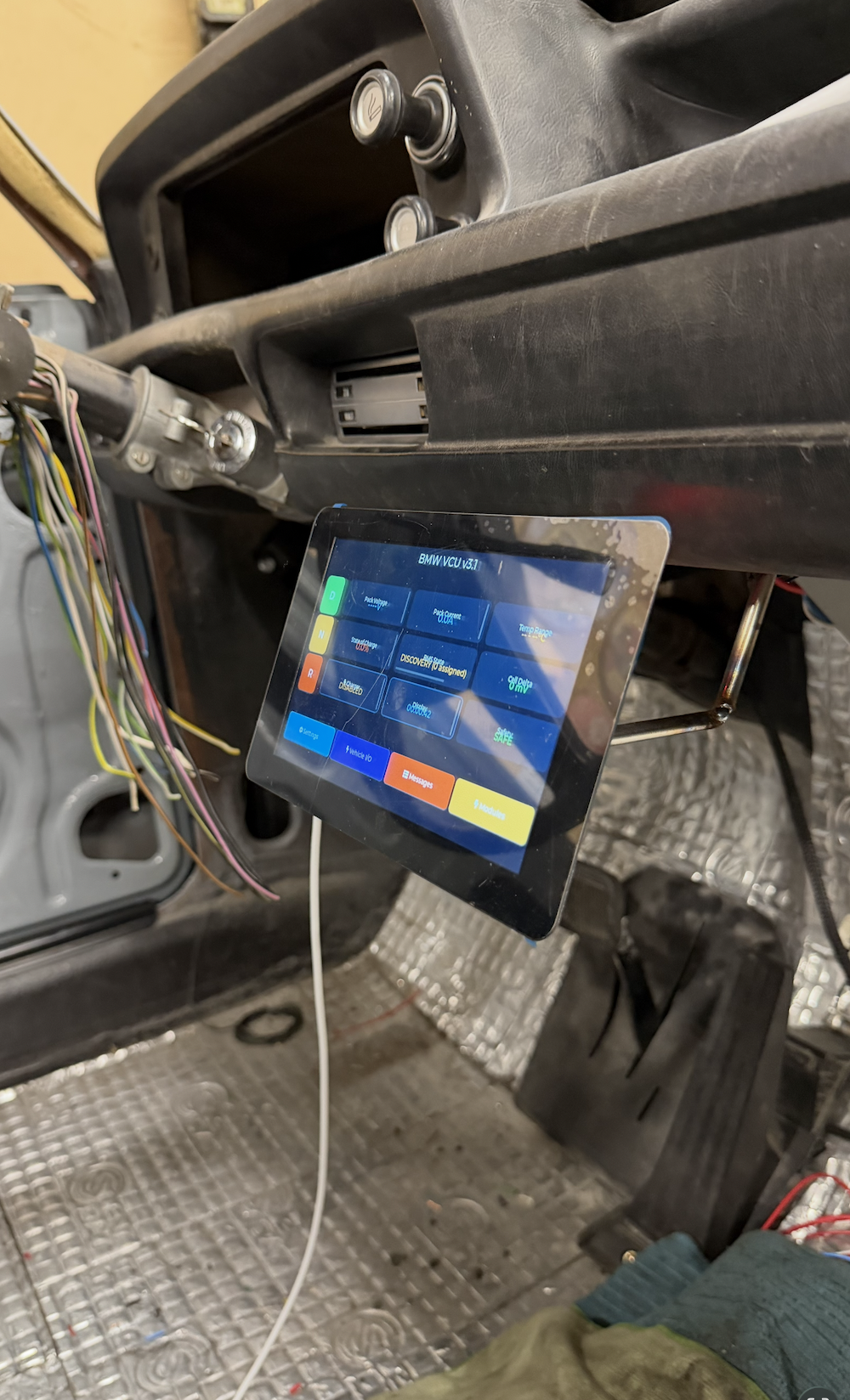 Desinged a frame for esp32 display (lvgl, can, esp, touch display) Original plan to have Golf GTI seats did not happen, as seller couldn't find the seats. So plan B, BMW 2-series (G42) alcantara sport seats. This simple seat replacement accumulated way bigger project, as original seats sit high on top of transmission tunnel but new seats need to go to bottom. So first the tunnel was cut a bit, then bit more.. until we realized that they don't sit straight in front of steering wheel.. So need to cut more.. and eventually, whole floor was completely removed and made a new one to make the seats align and sit low enough properly