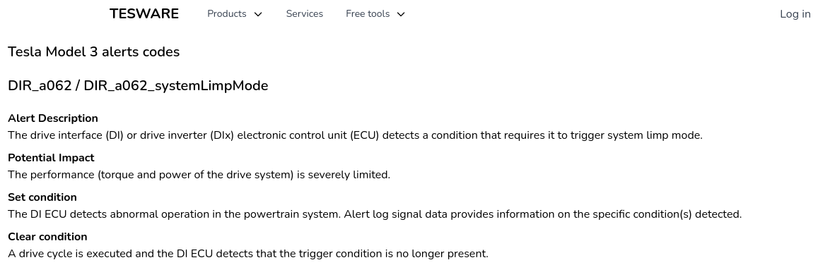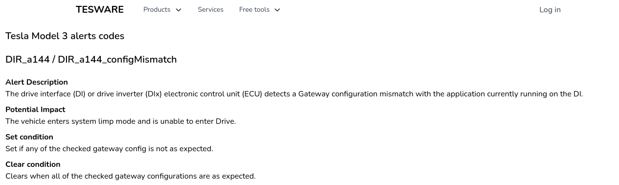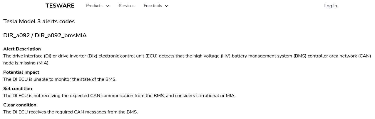 My drive unit probably has last one active alert DIR_a155_vcfrontMIA (The DI ECU is not receiving the expected CAN communication from the VCFRONT, and considers it irrational or MIA)