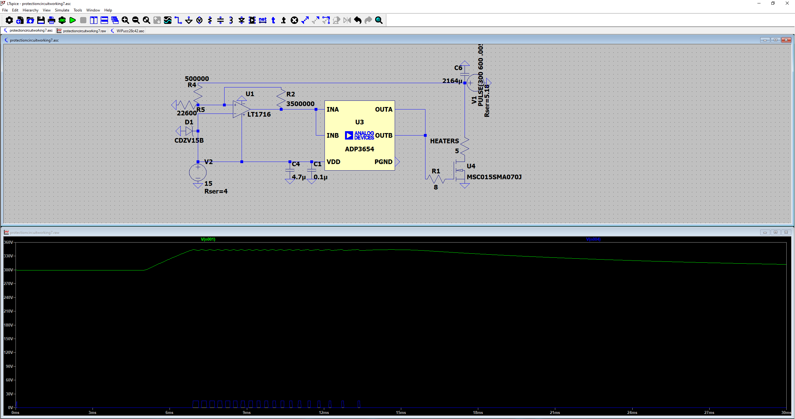 here's the voltage limiting circuit, for anyone who might be interested to check it. It's not exactly what we've made because I couldn't find SPICE models for everything, but this is the idea.
