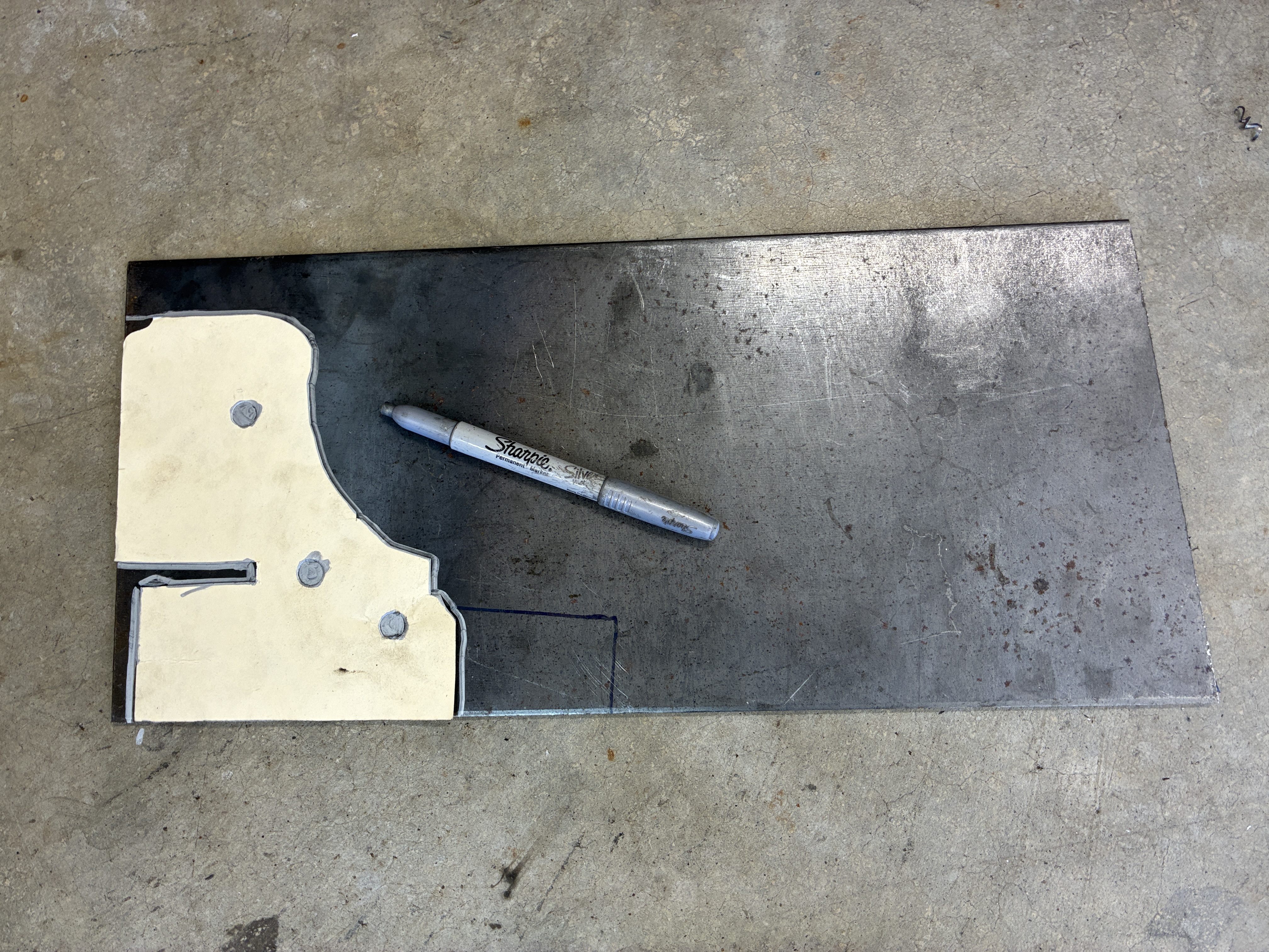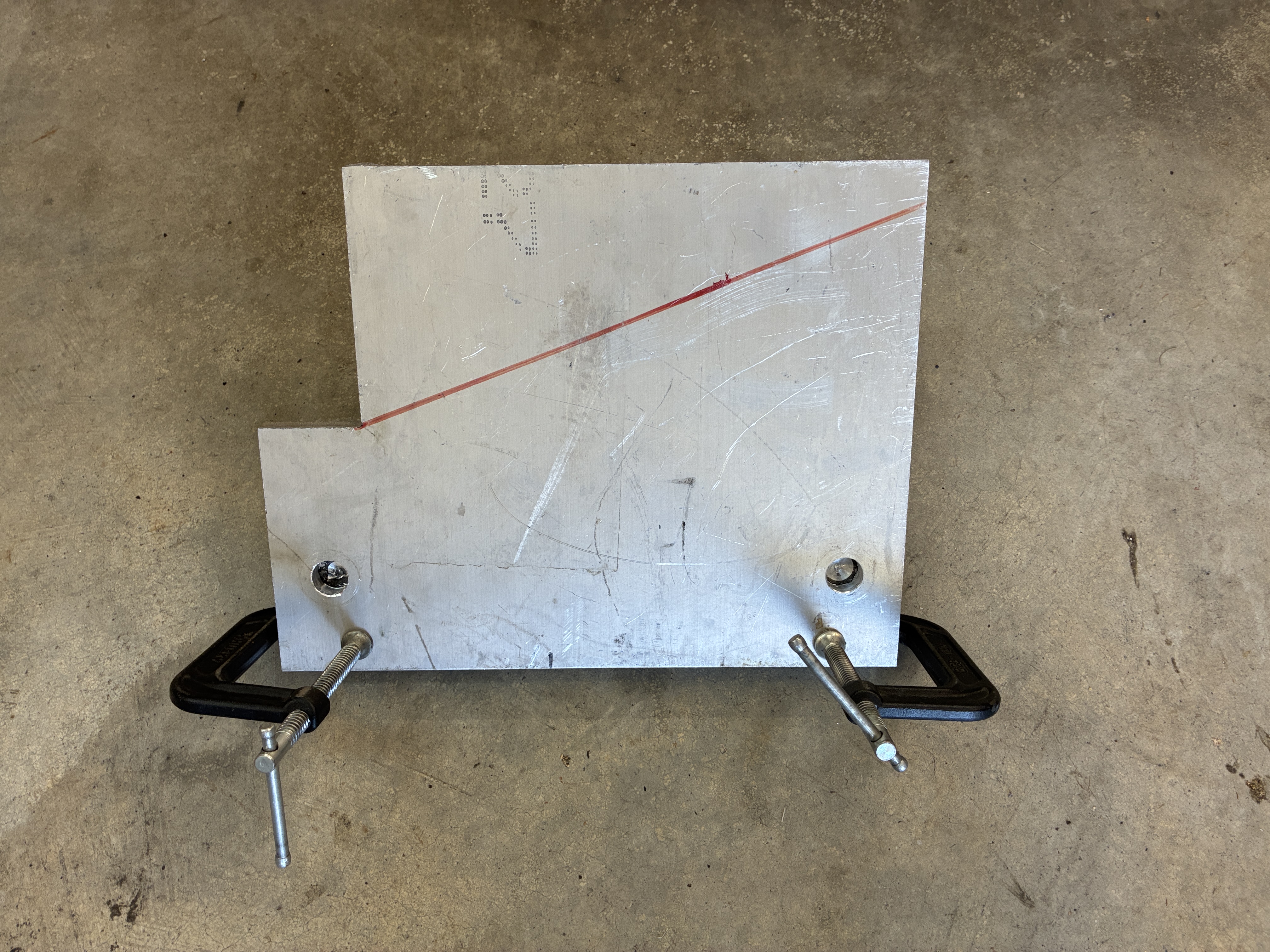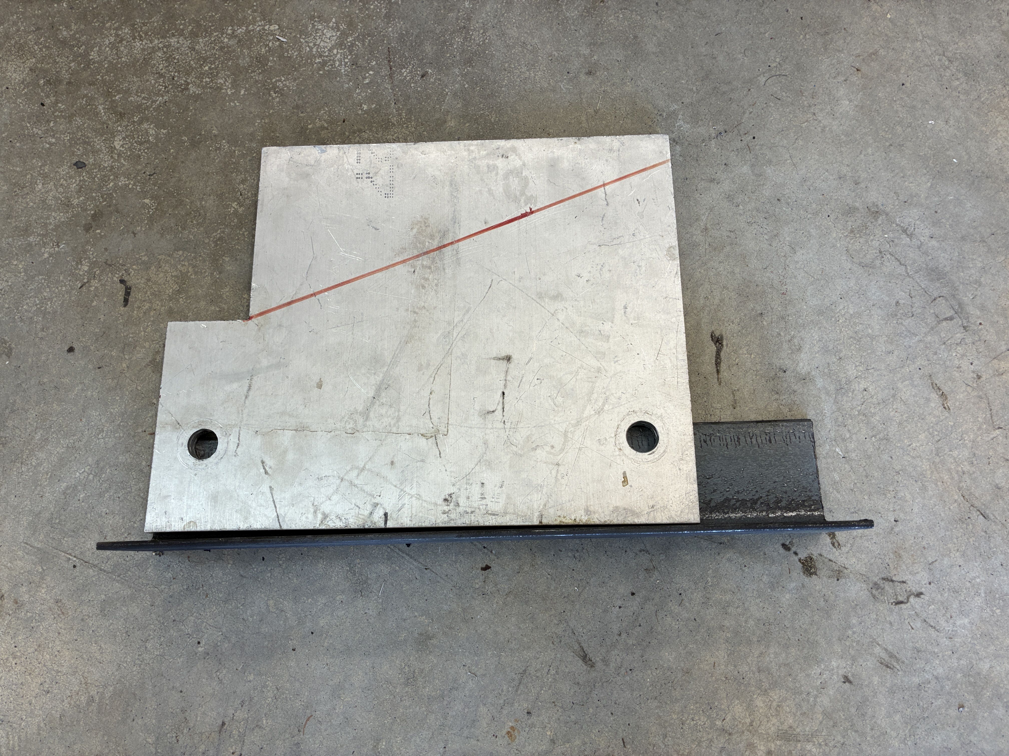 and so here I am making a copy of a copy sort of speak and using that large aluminum plate to transfer the two bolt holes onto a 14.5" angle iron 3/16ths thick