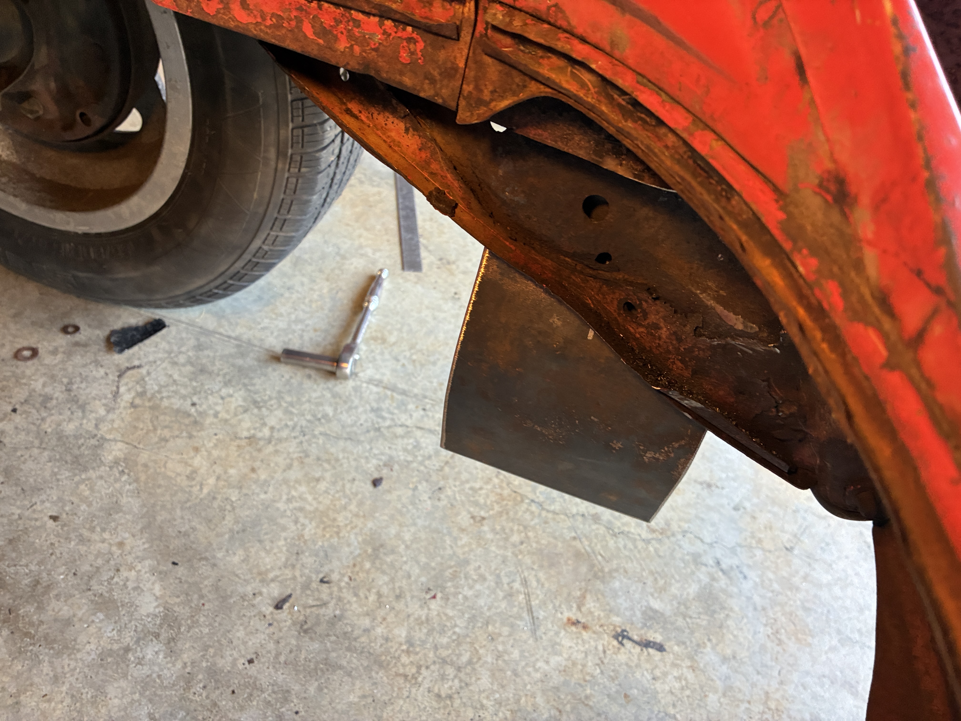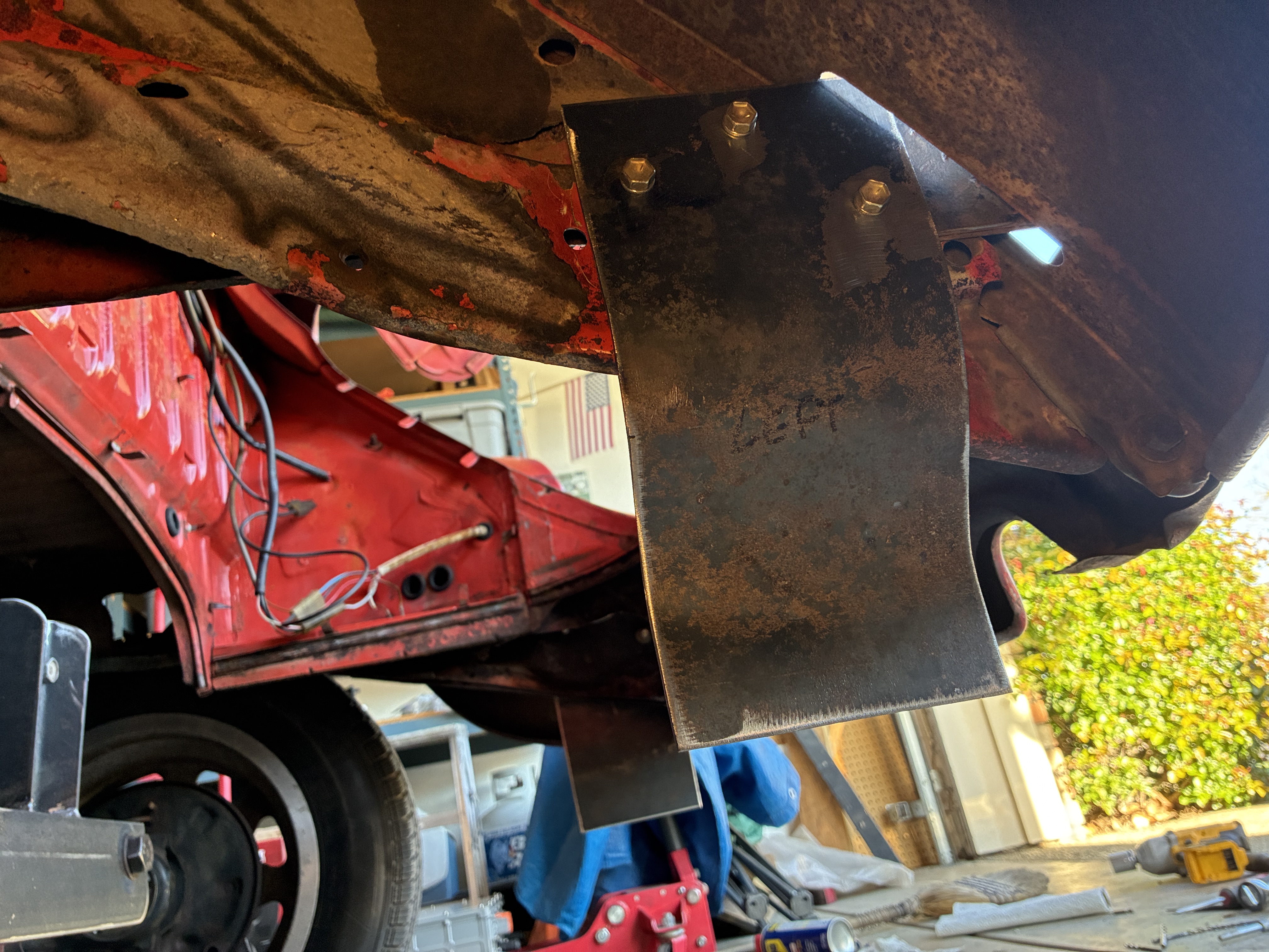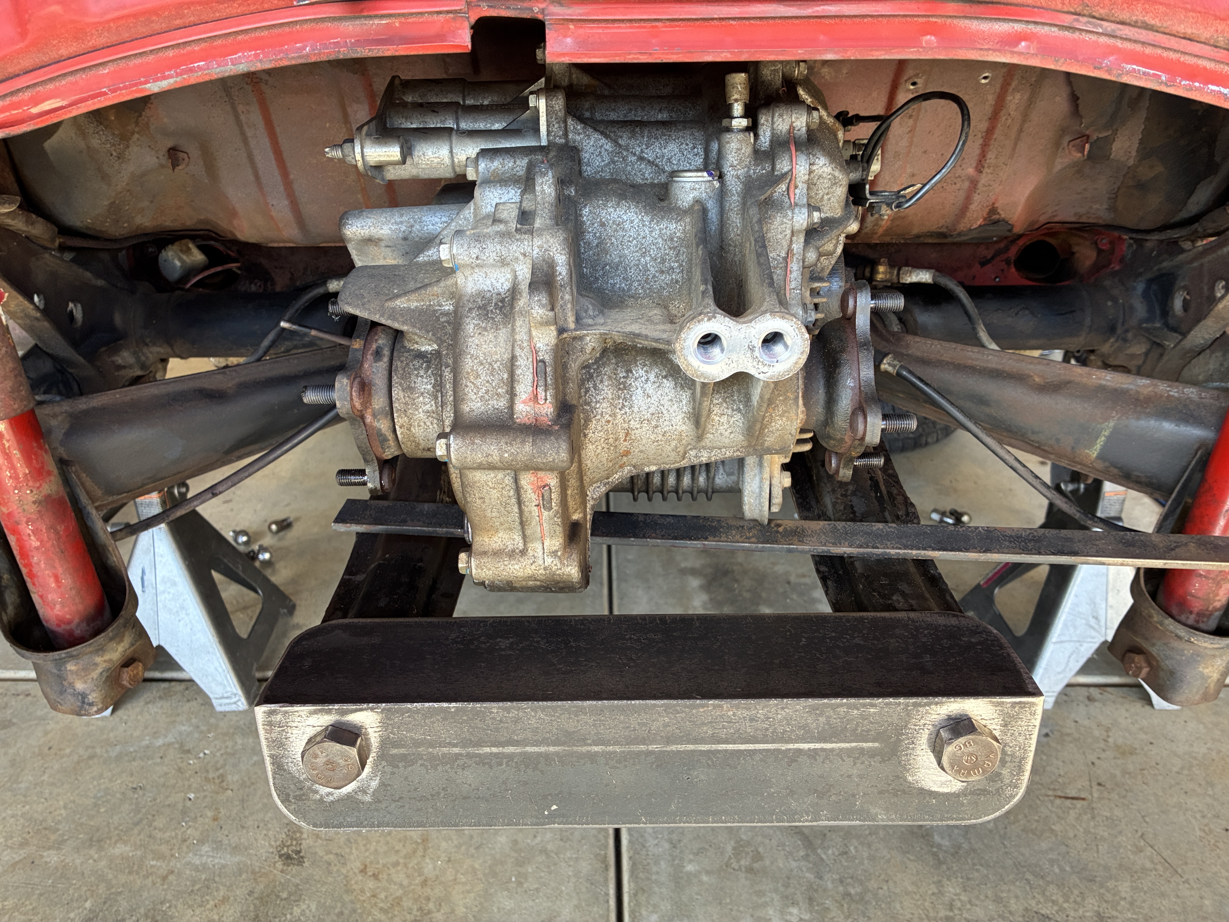 I actually had to shape [pronounced: "beat the crap out of"] some metal, in order to make the rear hangers for this bracket, which is suspended from the rear bumper mounting points (commonly referred to as rust and dust)