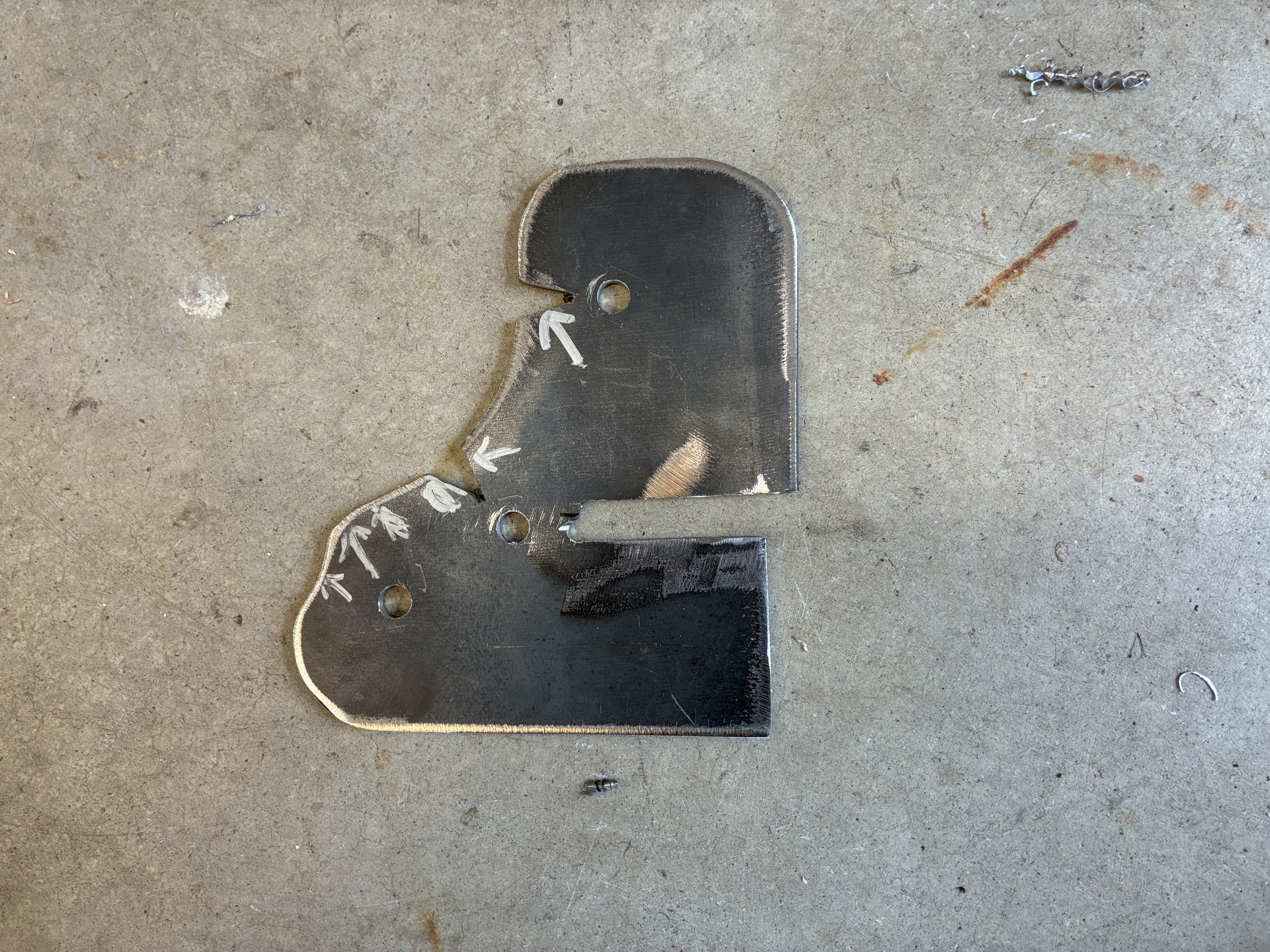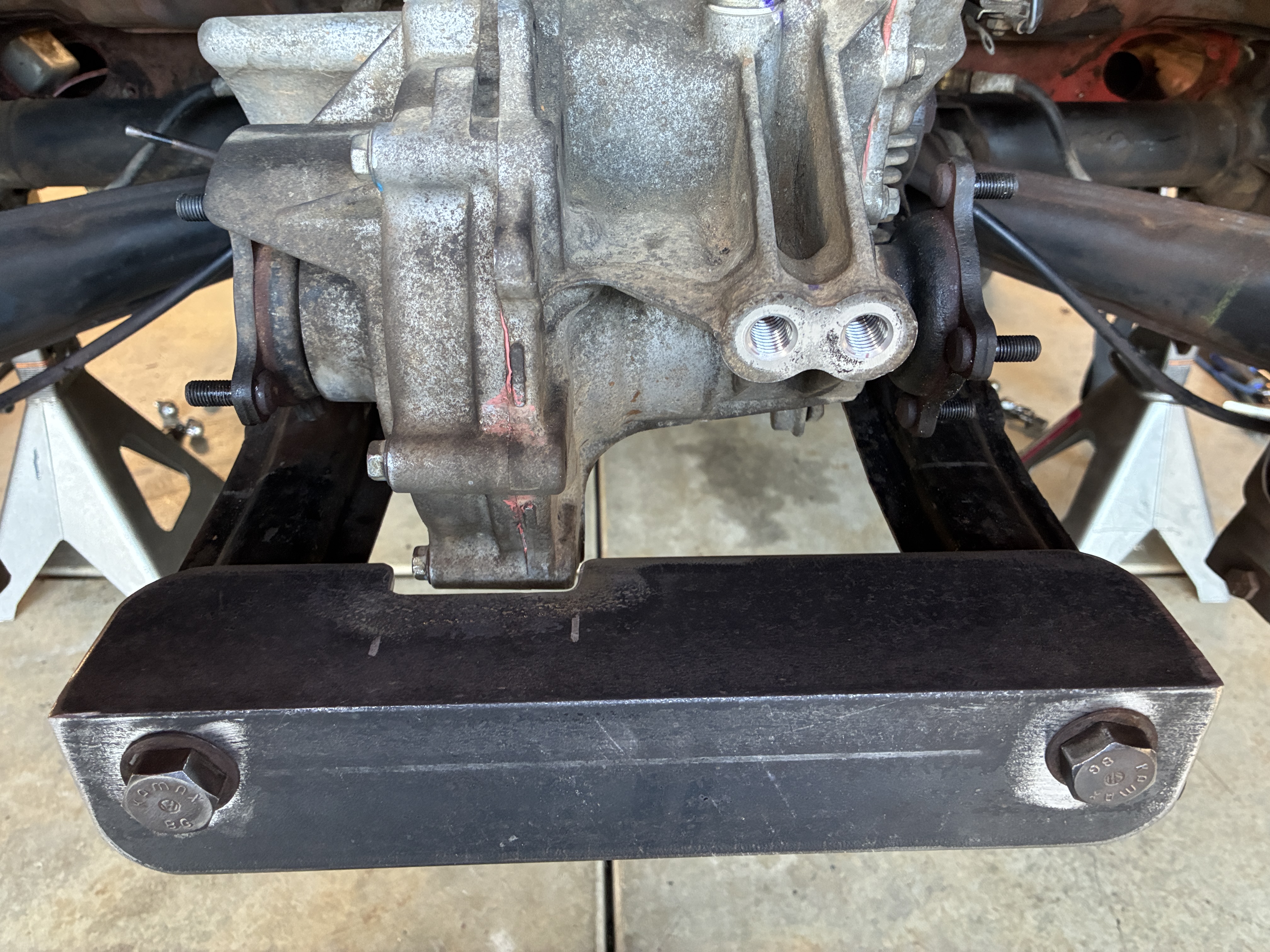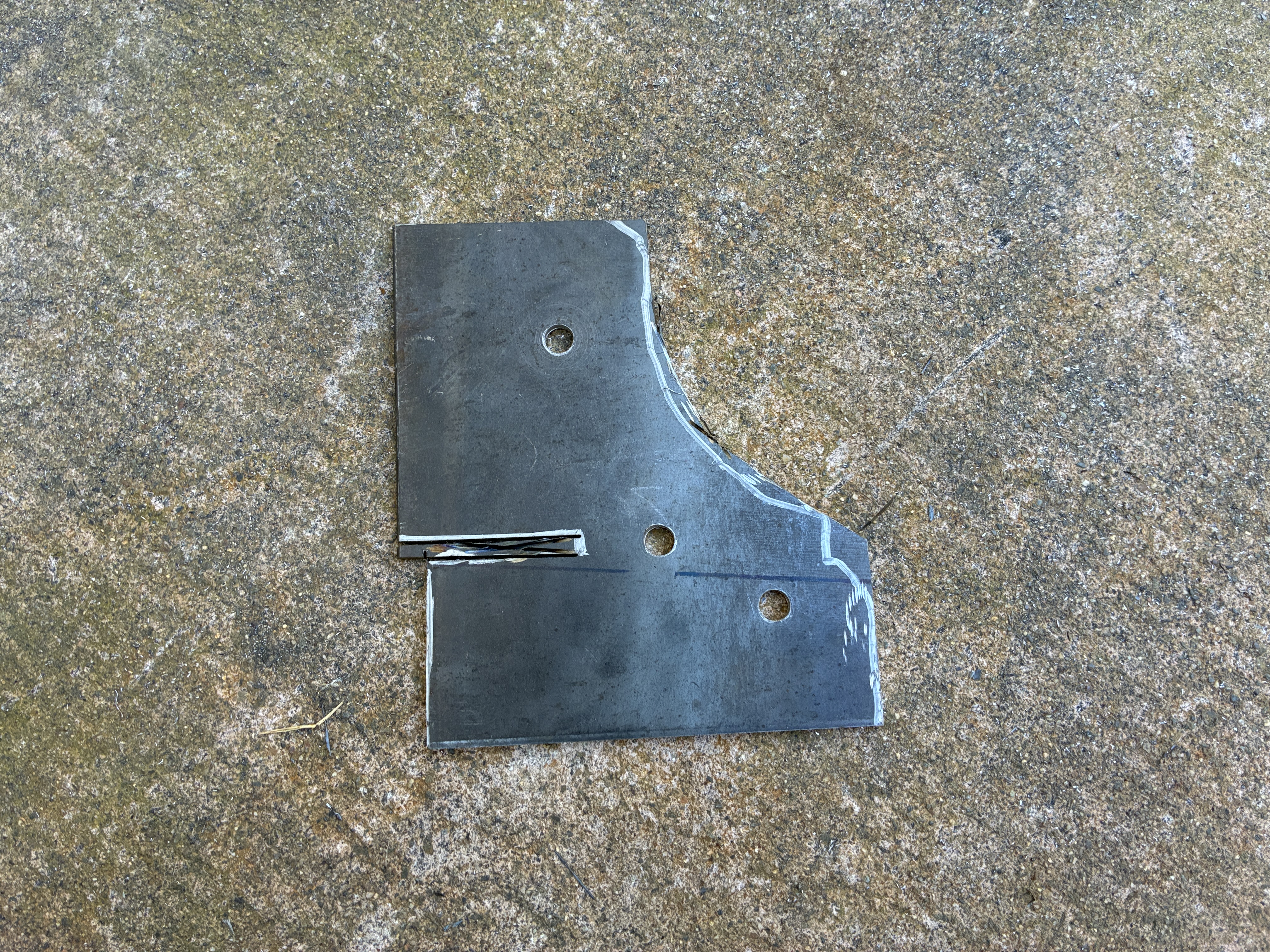 take this fugly plate that was supposed to serve as the rear motor mount, this was Plan A, well it did not work out, but it learned me that the frame horns that the MGR rests on are not parallel to the ground but that they swoop up a bit in the rear, had I not mounted this monstrosity to the horns it would have been nearly impossible to find this out