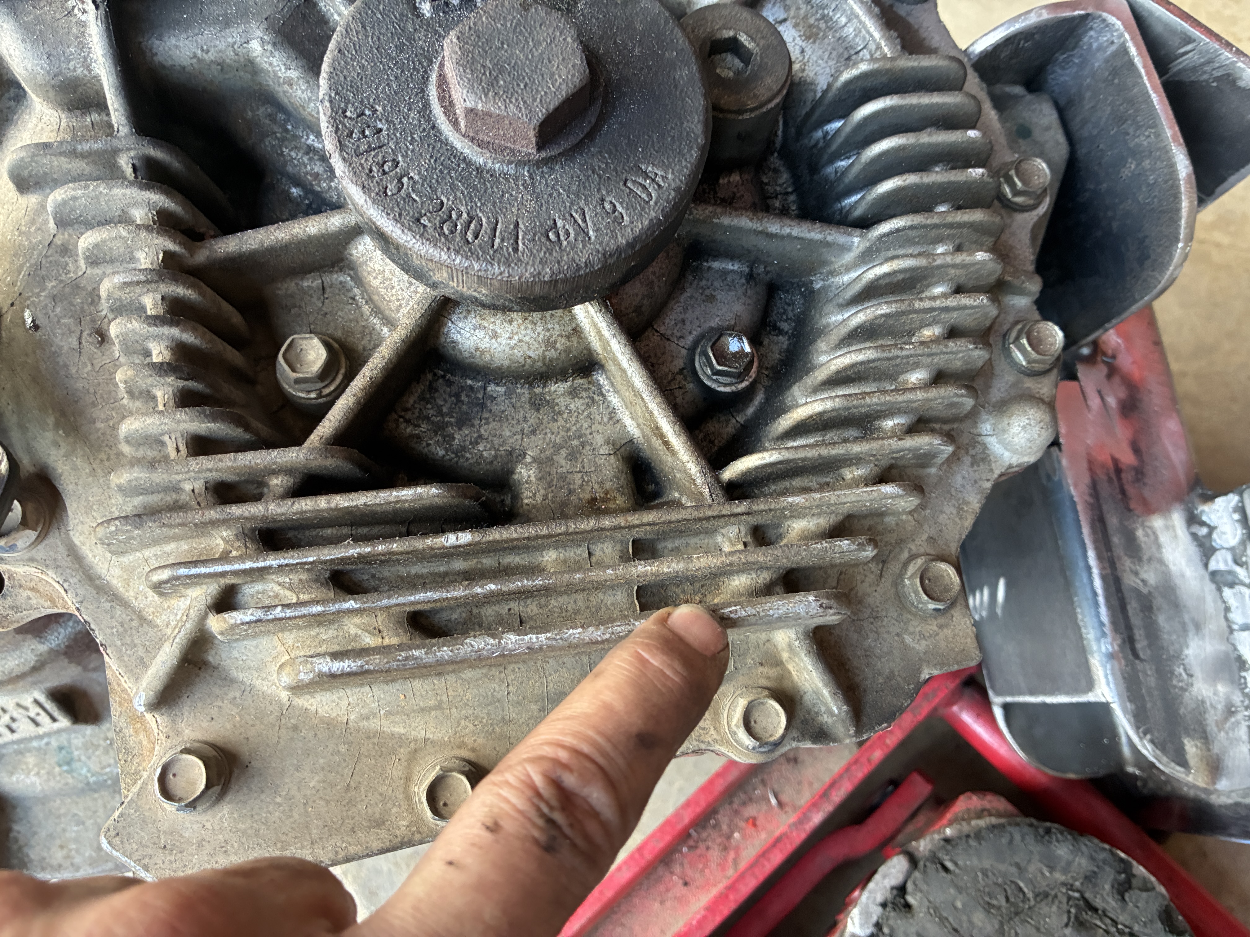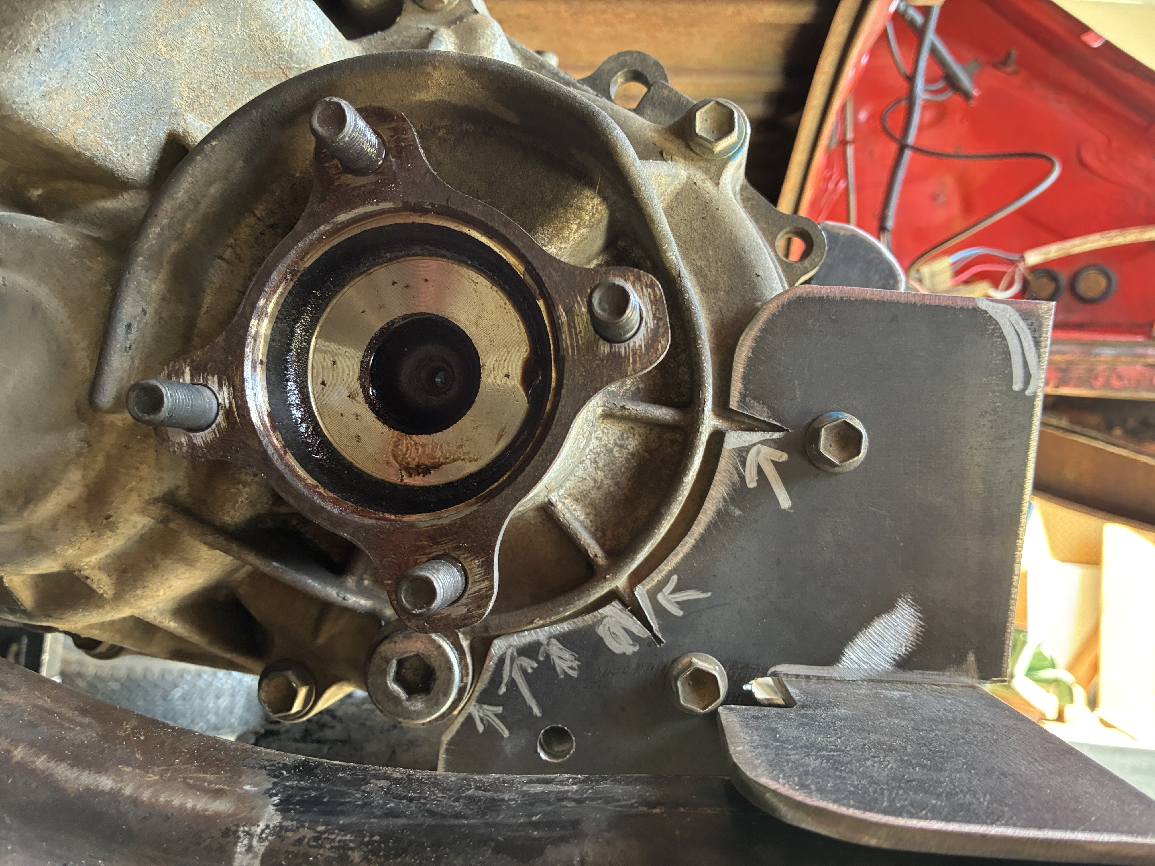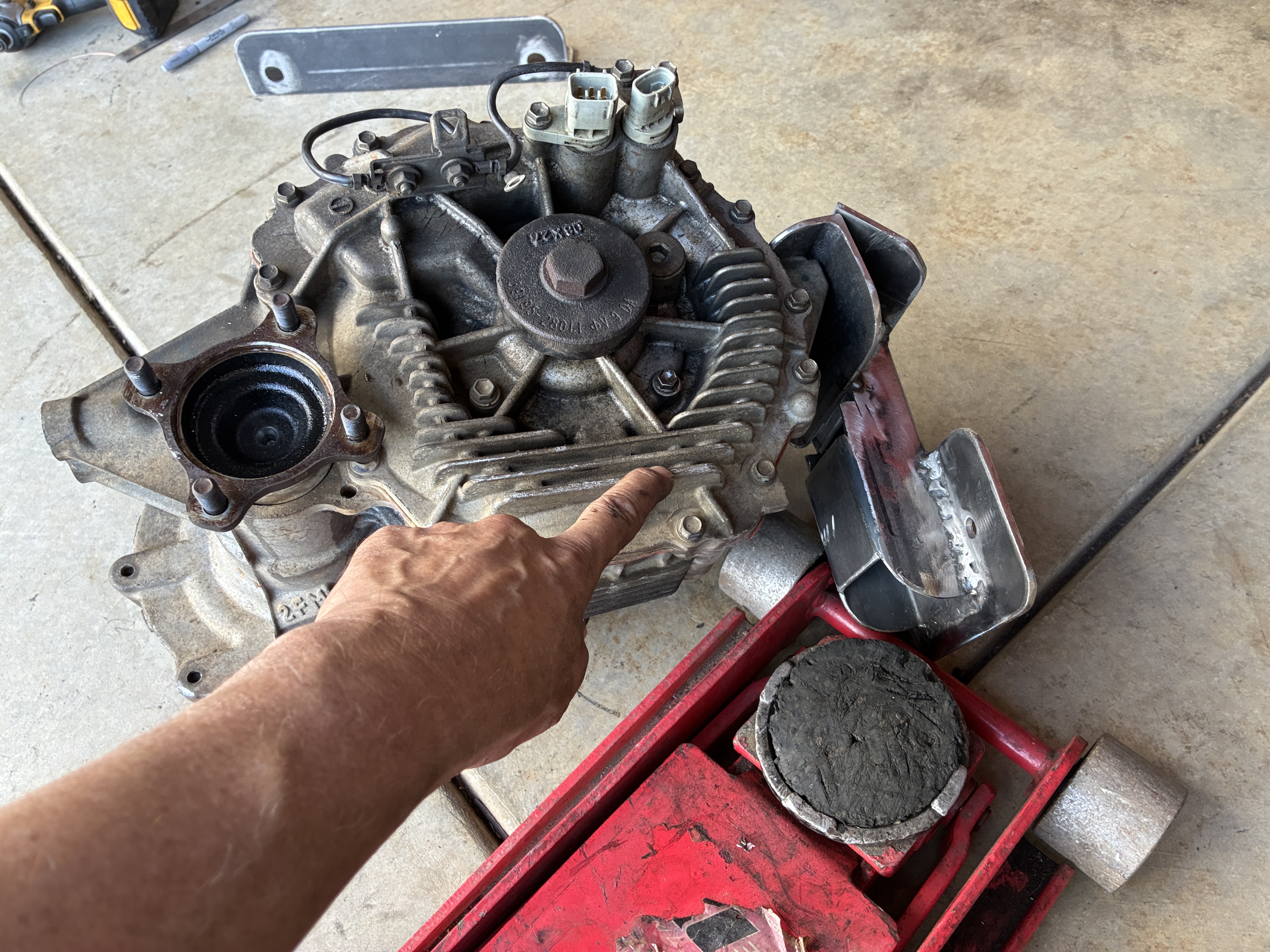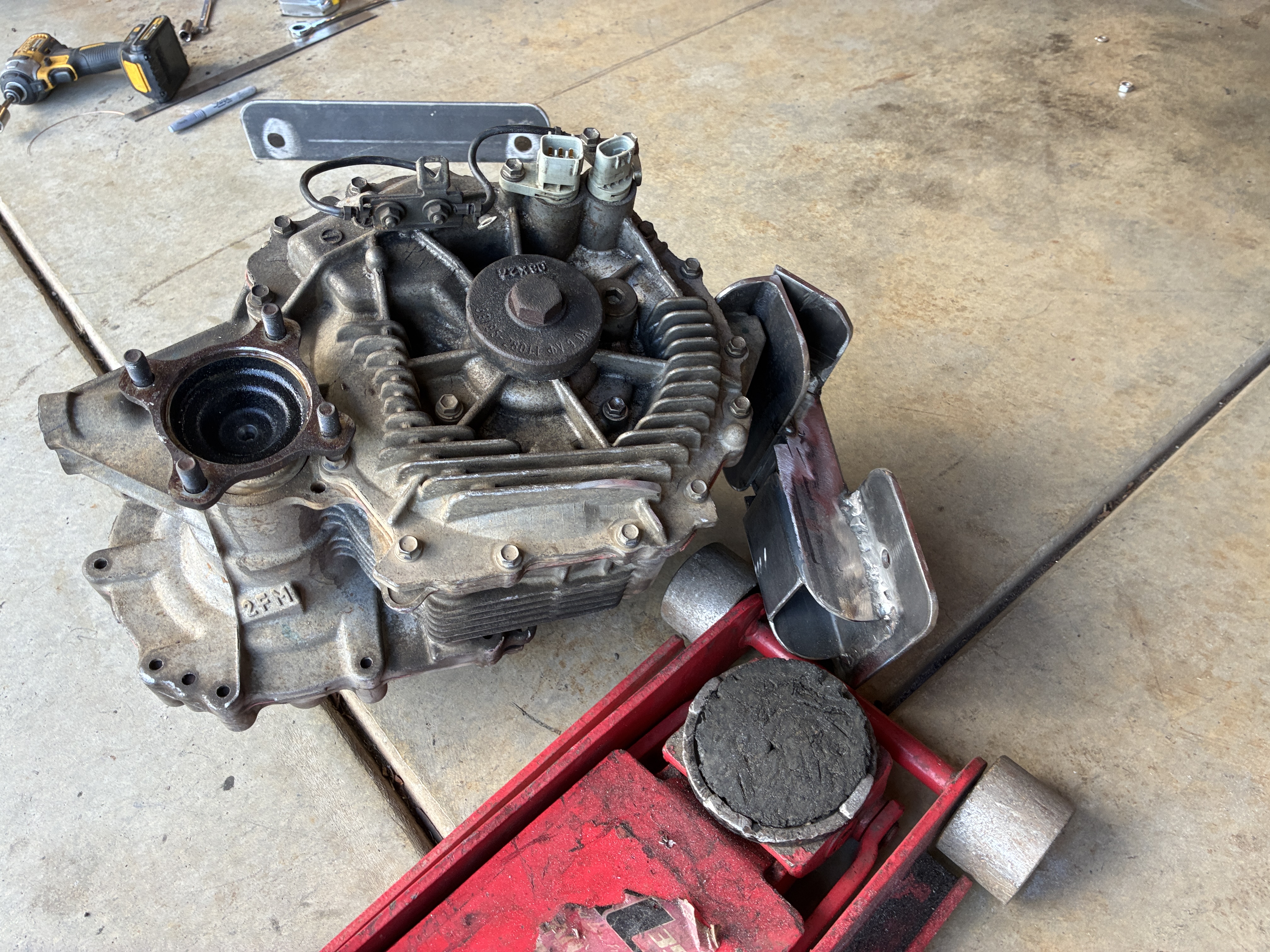 in order to get the motor to sit as low as possible on the frame horns and be centered to keep both of the CV Axles as close to the same length as possible, one of it's bottom cooling fins had to be tickled a little bit
