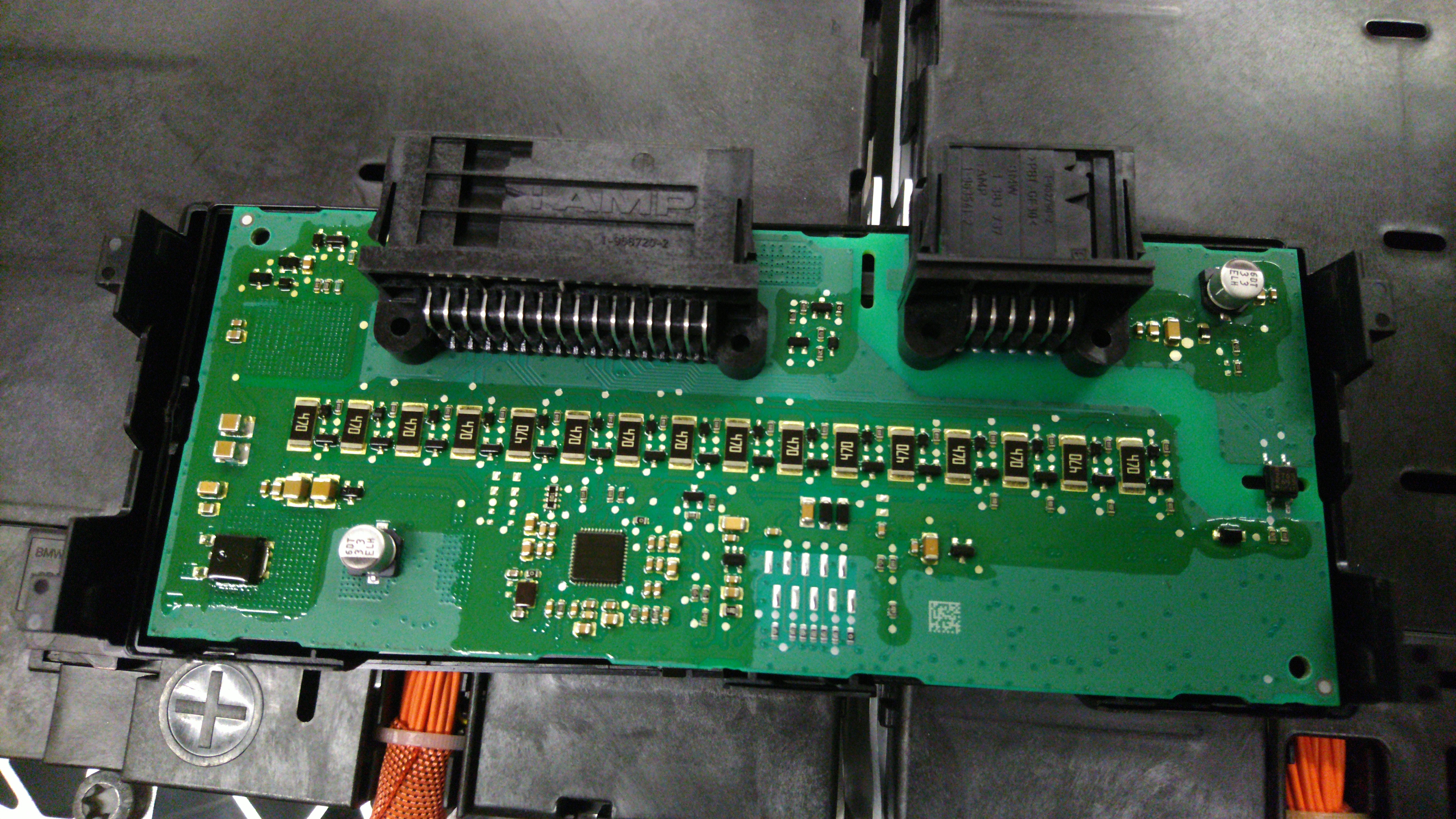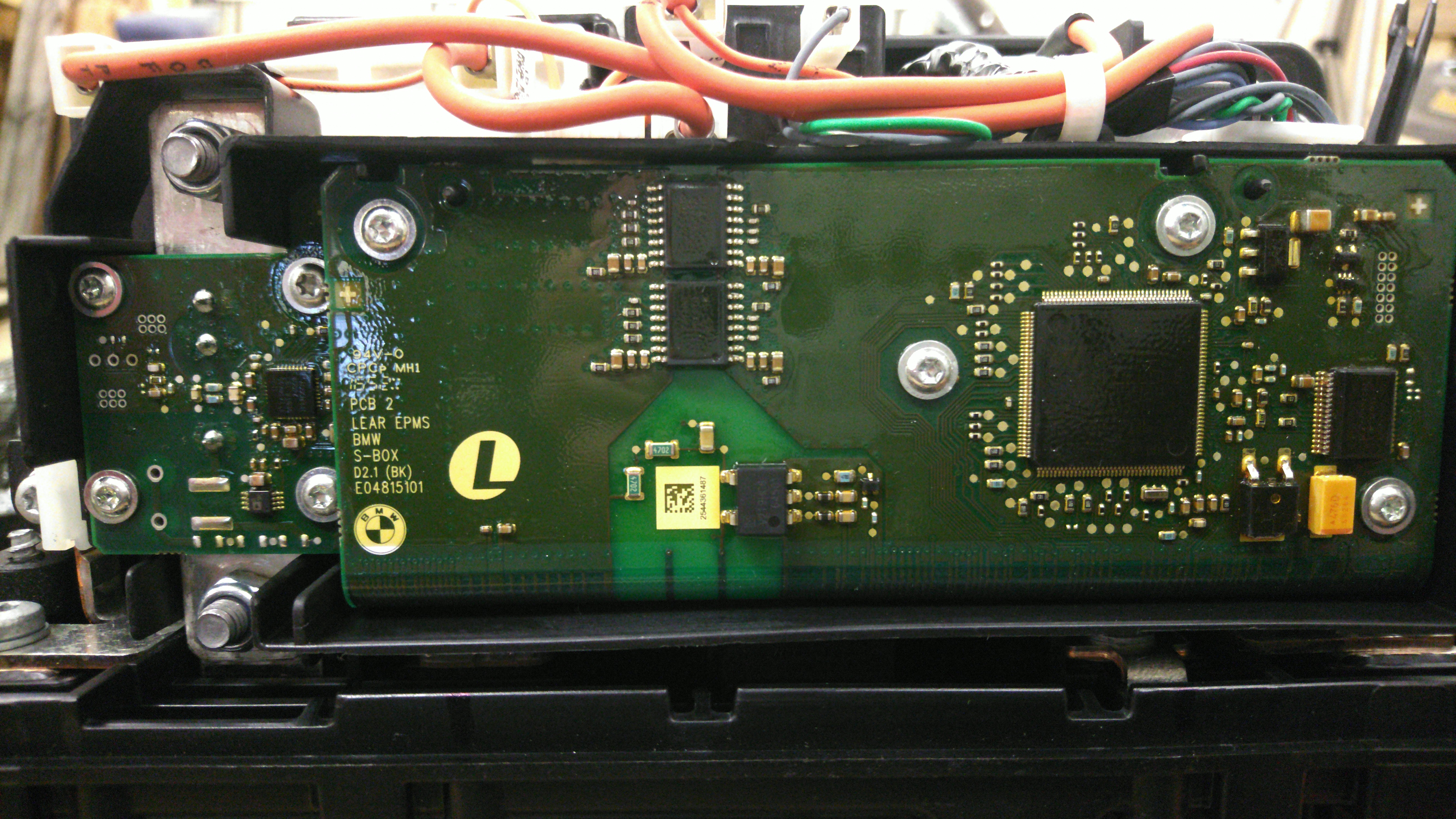 I took some photos of the BMS inside an x5 battery, which is the same stuff in yet another shape. If someone is interested about the markings on some of the chips, I have a larger set of photos where I tried to capture most of them (not easy because of goo) so just ask.