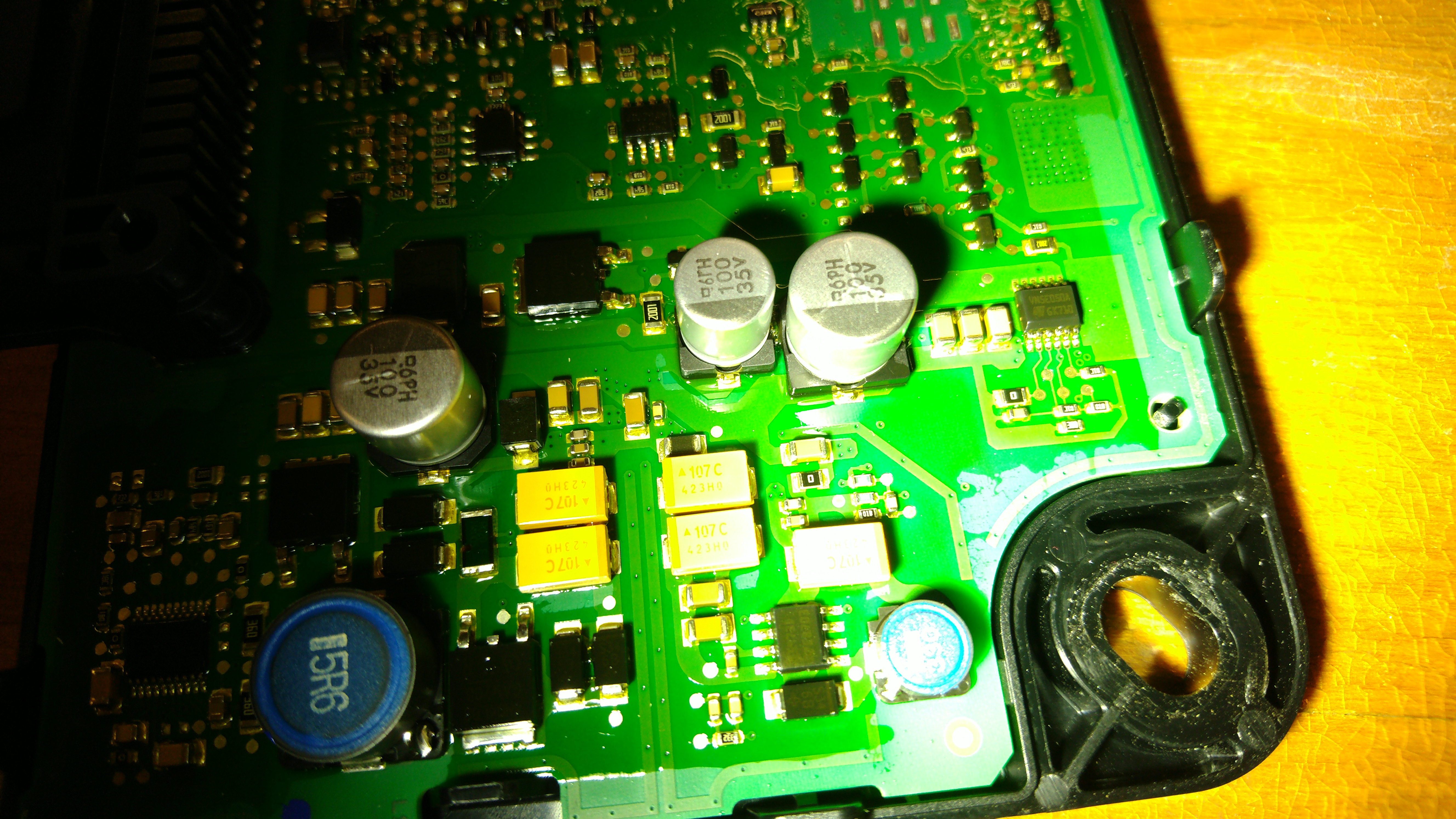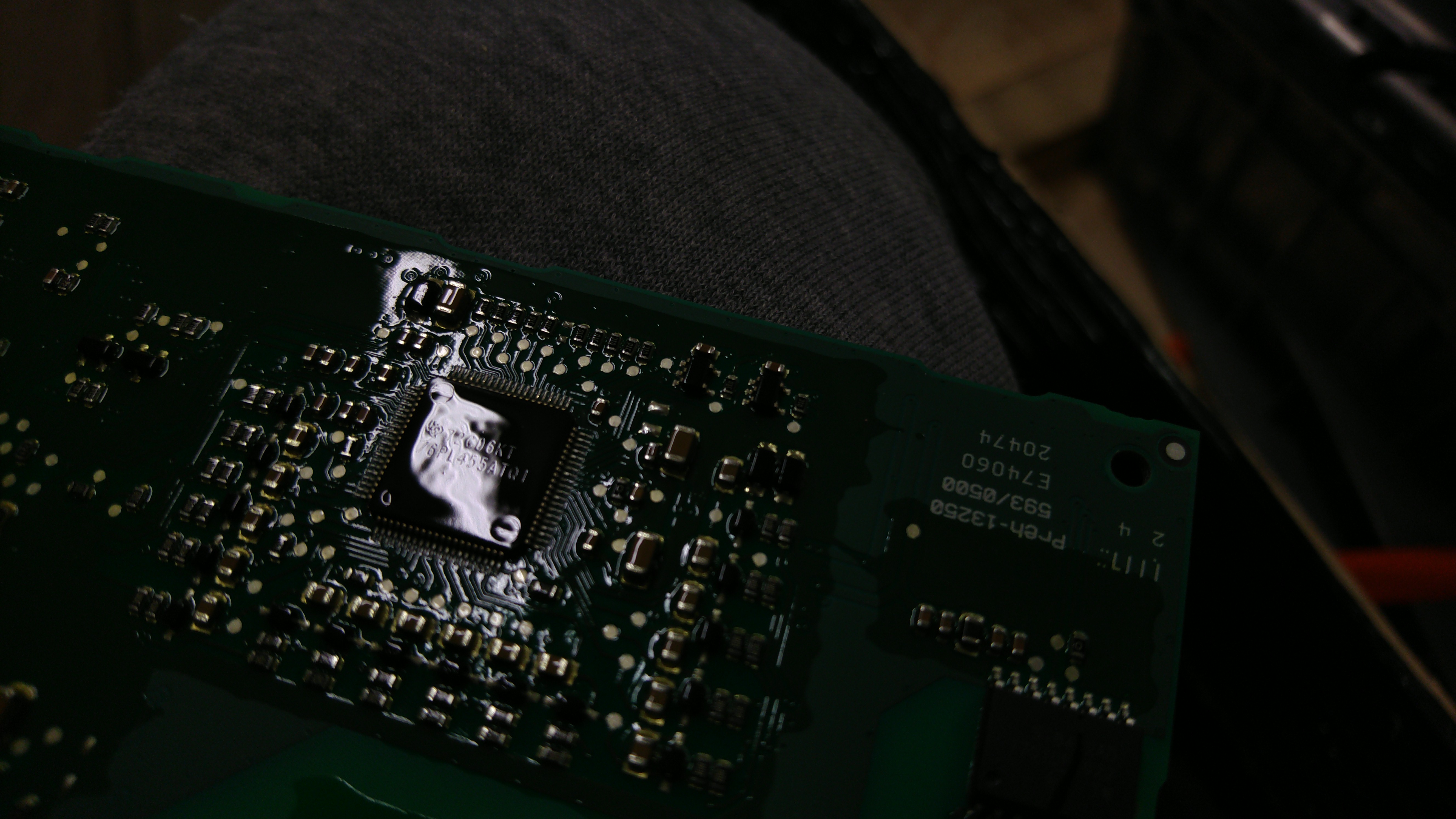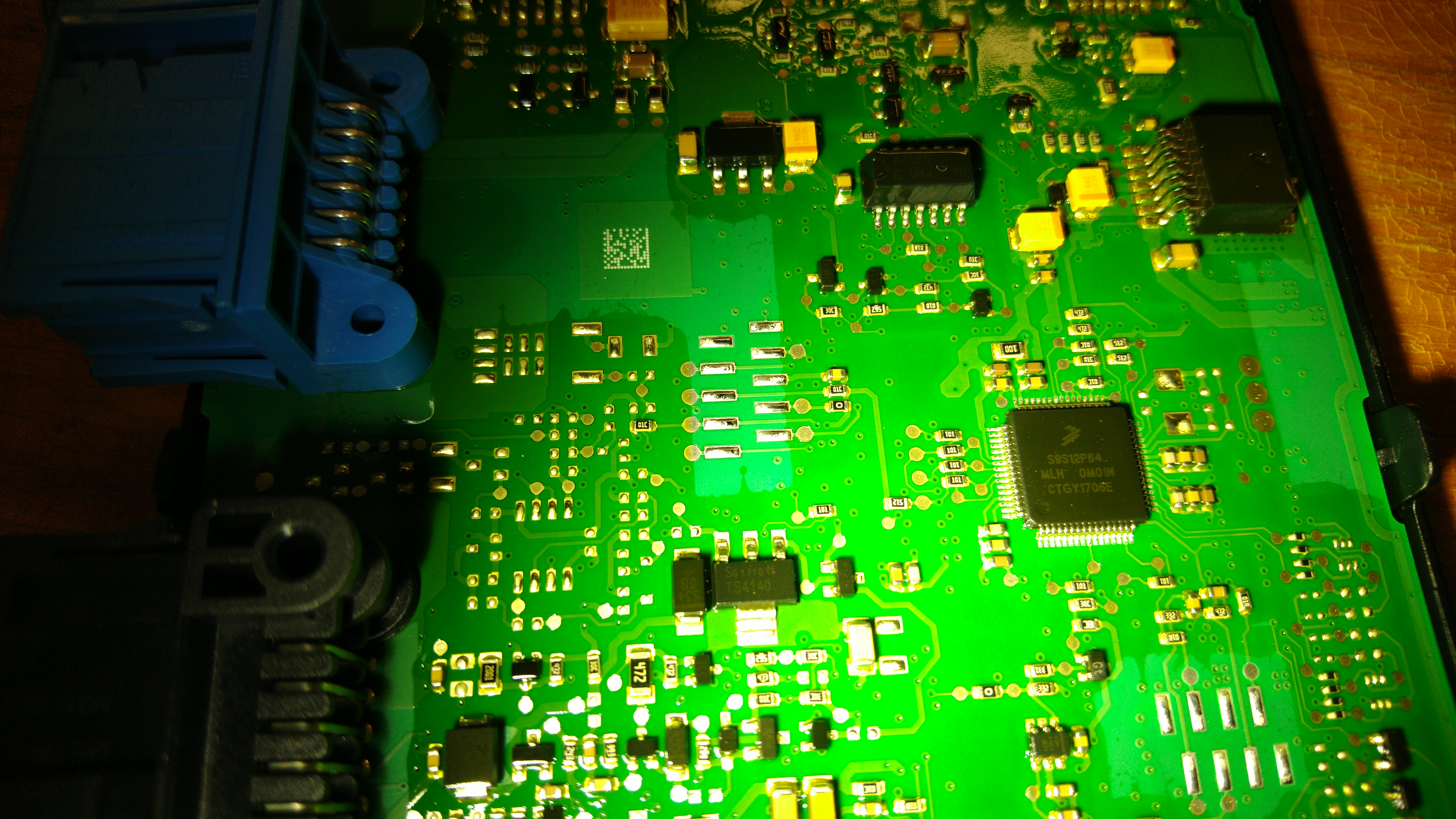 The BMS master has lots of goop and a ridiculously large Freescale chip underneath ("SC667333MLU1 OM14X XAA1708F"), and a Freescale HCS12 MCU on top with various little ICs.