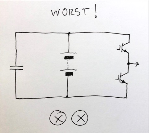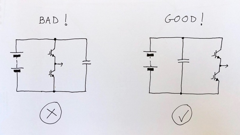 Hmm, thats exactly how my Polo inverter is wired up. The battery cables connect right to the same terminals as the first snubber on the right. No blow for 7 years. Maybe the low power (500V, ~100A DC) and 10 Ohm gate resistors are beneficial there?