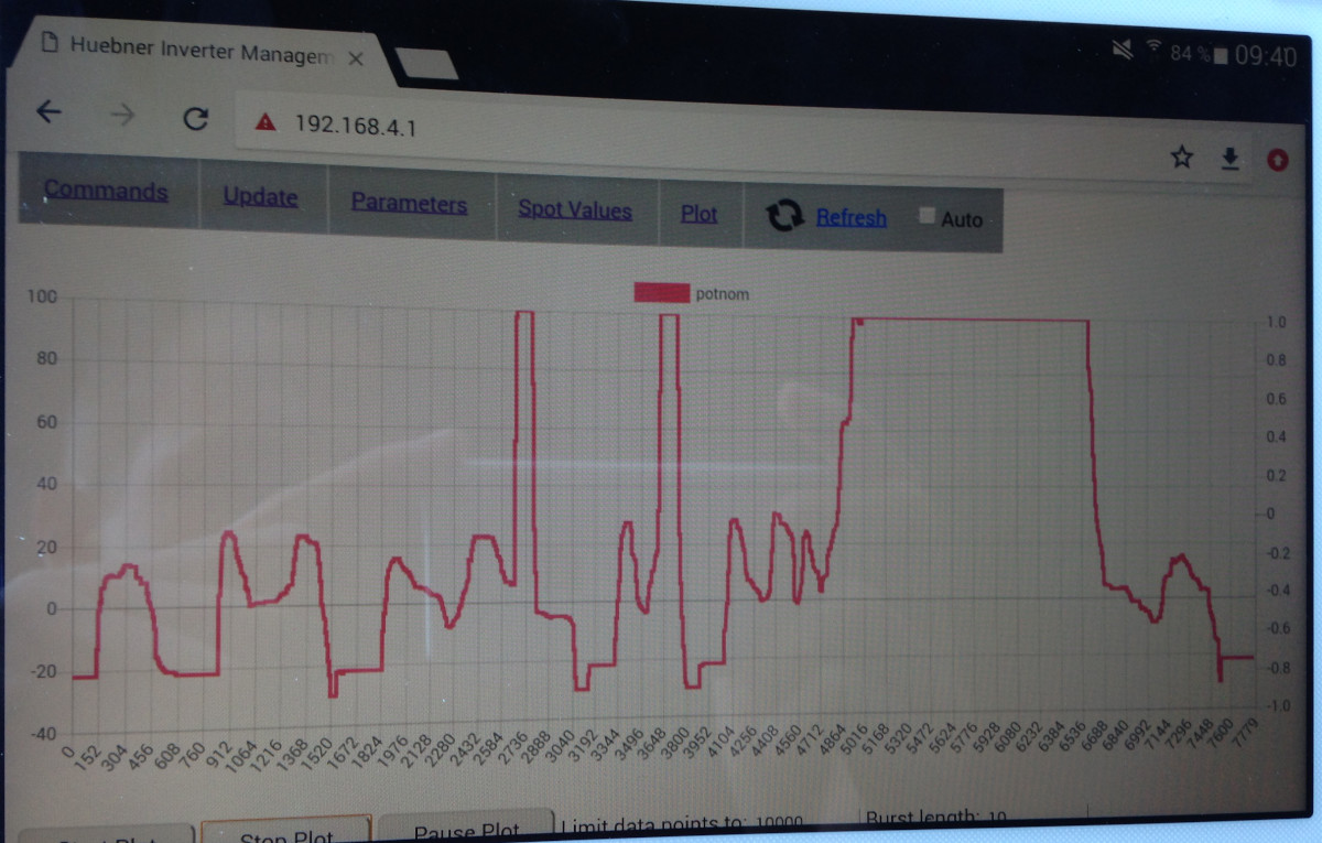 But the test drive got a bit more exciting then needed. First drove the car at low speed in the neighborhood and it worked. Then out on puplic road for speed test and the car started to be jerky. Turned of the main road and it got worse and worse. Was thinking, how am I gone get the car home and what has happend? A quick look at spotvalues revealed TMPHSMax, scroll down to temperature and ~70 degree C in heatsink, my limit set to 85. AHA! I had disconnected the cooling water pump during tests in the garage and forgot to reconnect it. Car now worked again and I could drive it home without problems.