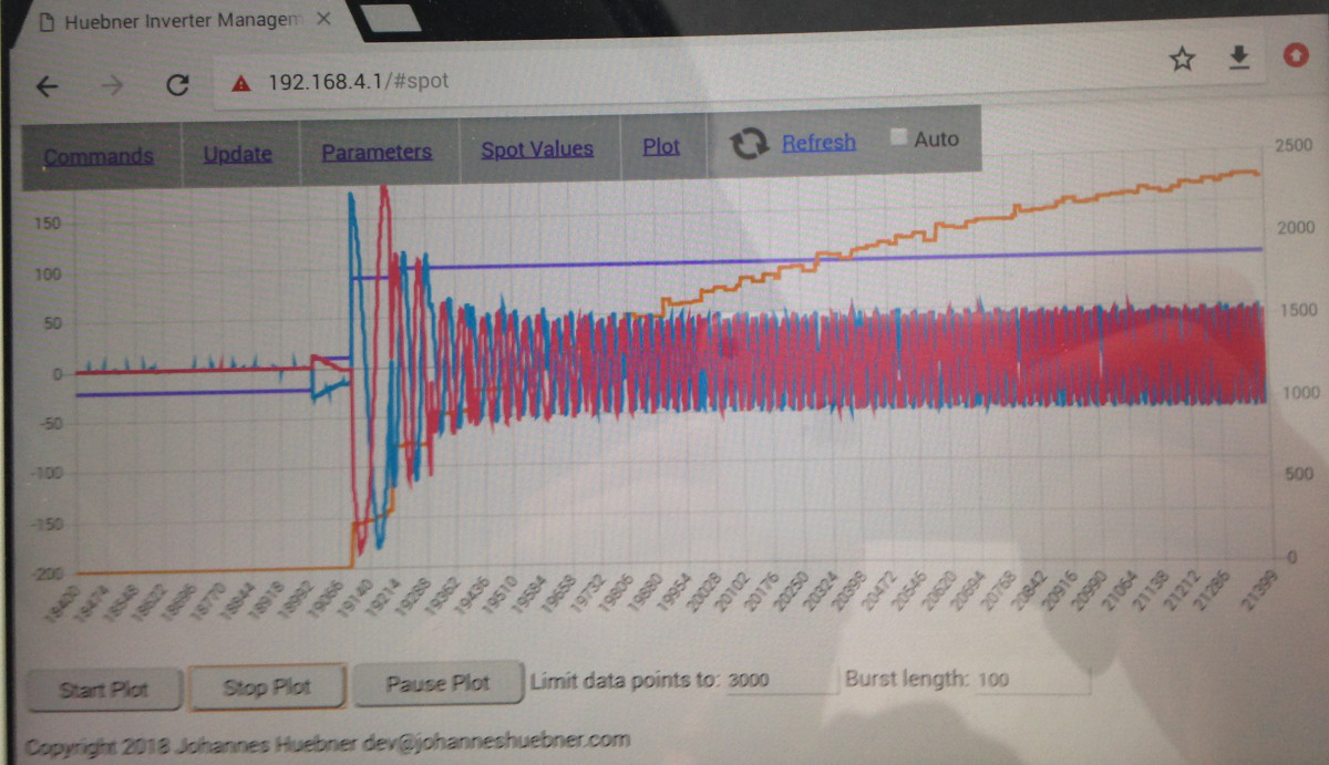 Imagine a setpoint of 20A limit and voltage limit of 392Vdc. Inverter would begine from 600V rectified and tried to match PWM to 320Vdc battery actual voltage.