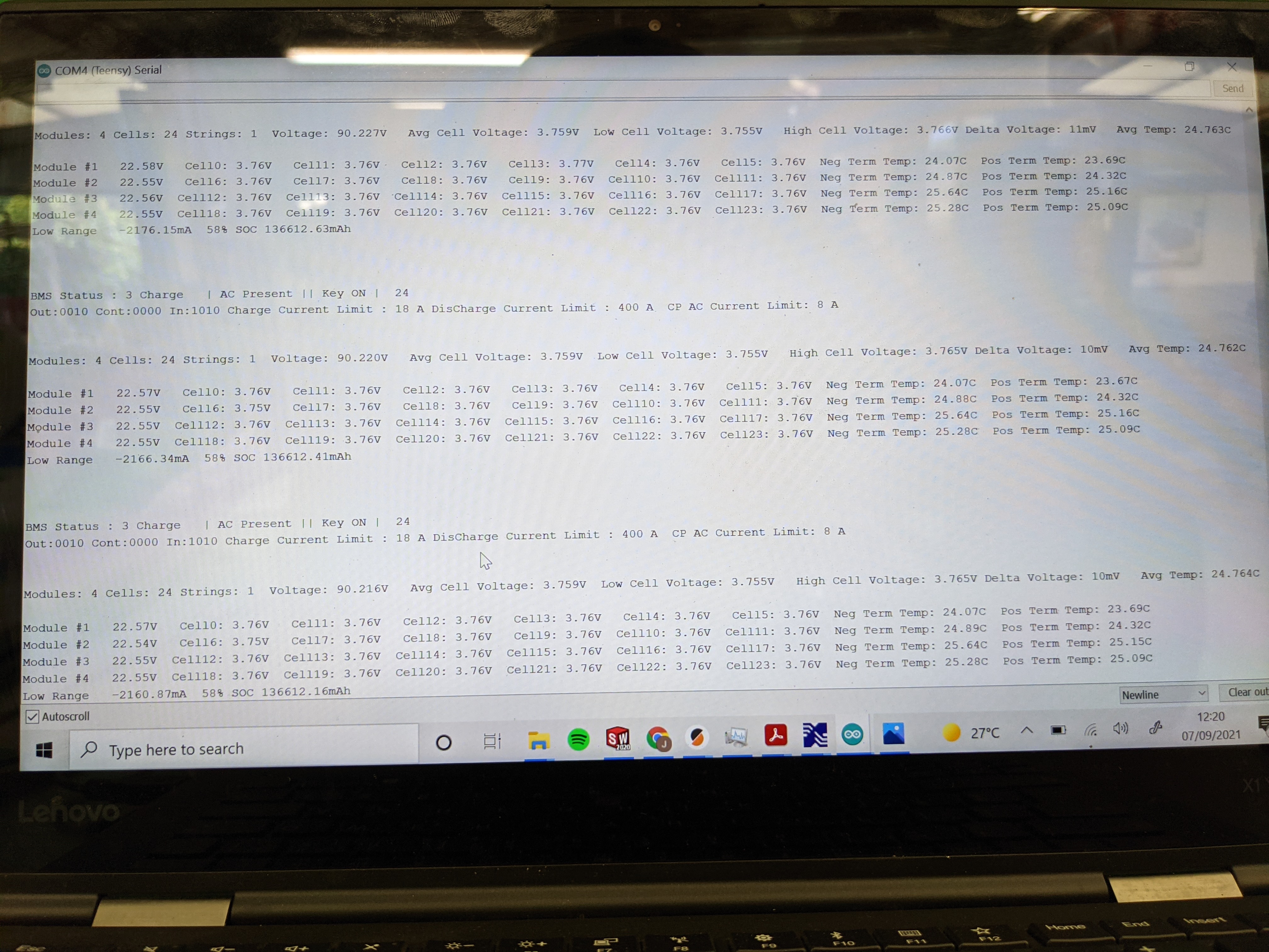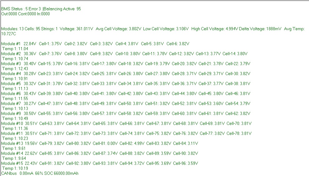 Again, please just show me the "standard" scrolling debug showing the status and cell voltages. This will give me some insight into what is happening.