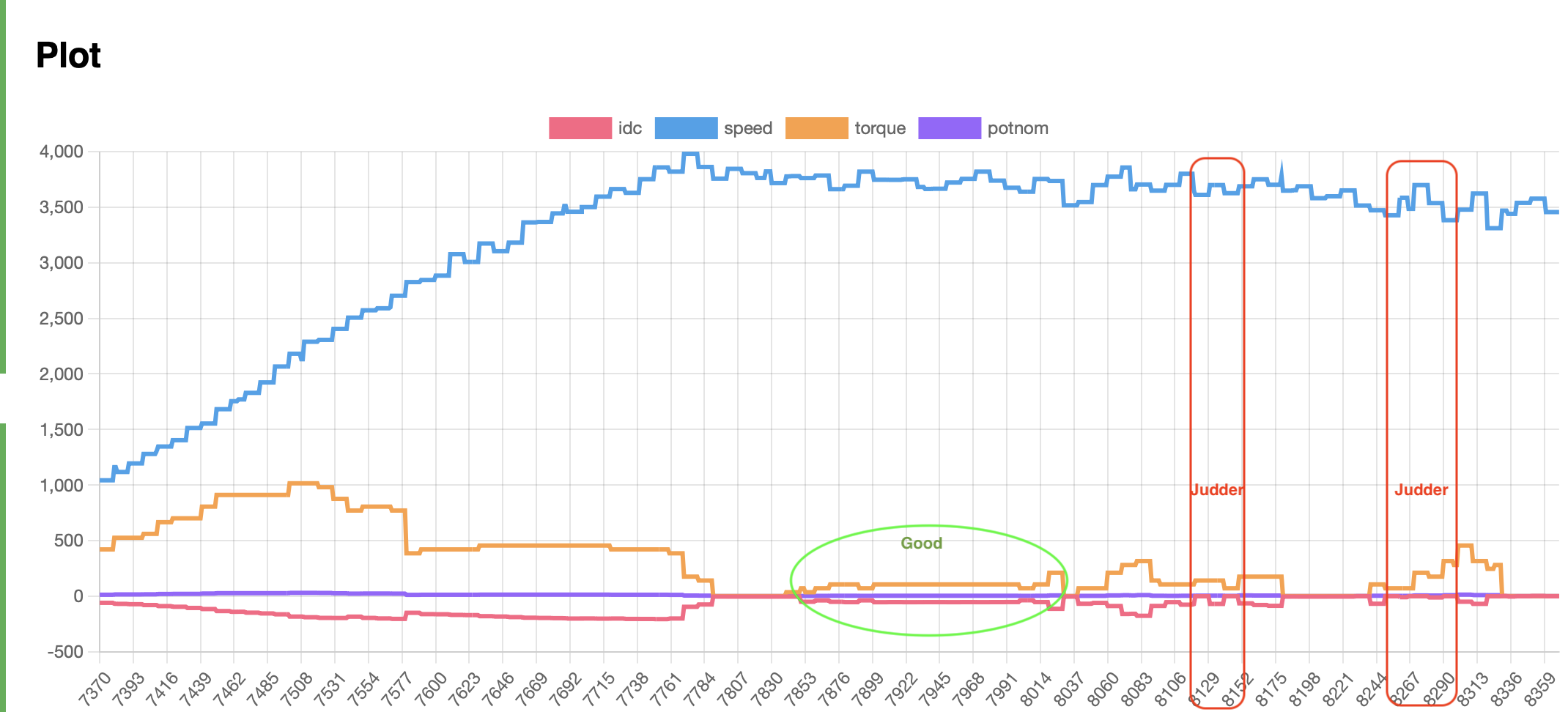 Some more unloaded in vehicle test runs, have revealed that at 3400rpm , @ 290v where the bus current jumps up, 3.5A to 7A, and a more audible whine occurs.