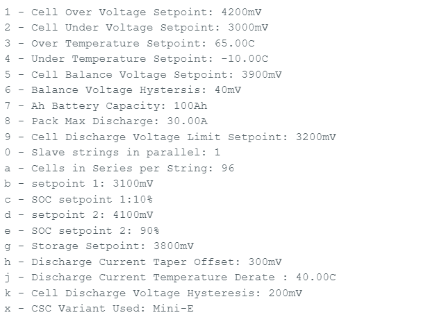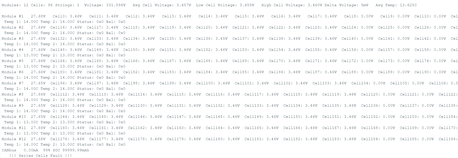 In one of your previous posts you had a screen shot of the Simp serial output and it correctly showed the 96 cell voltages. Mine is trying to show 16 cells per module for the 12 modules, so getting a series cell fault. I've tried some different settings for cells, strings, csc variant. Wondering if you have a chance if you could snap your Simp settings, I might see what I'm missing! I have the X5 edit for the 12 modules already.