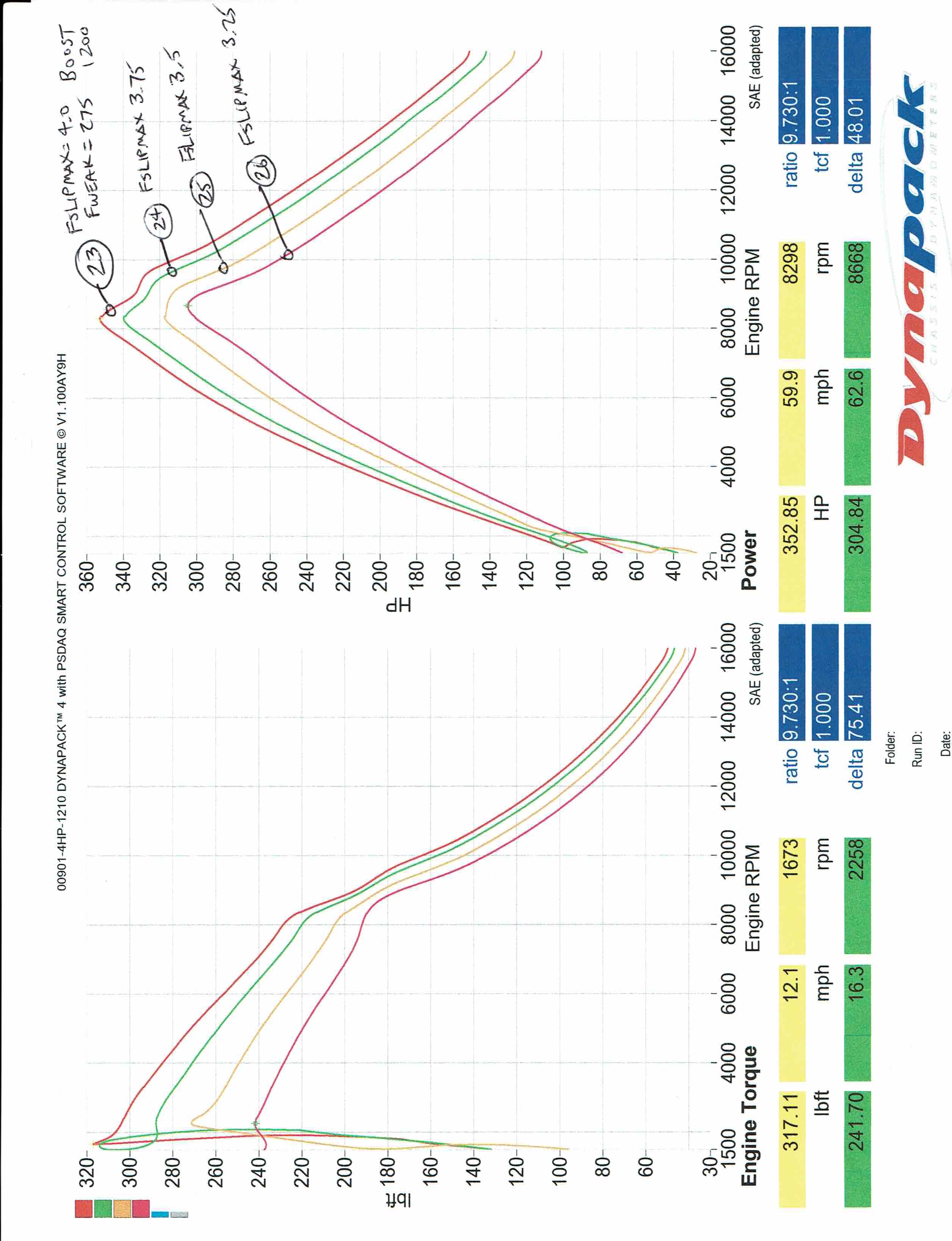 Good results at the dyno. Bottom Line: Max of 317 ft-lbs/353 HP - with low end torque limited by the dyno and conservative tune due to overcurrent errors.