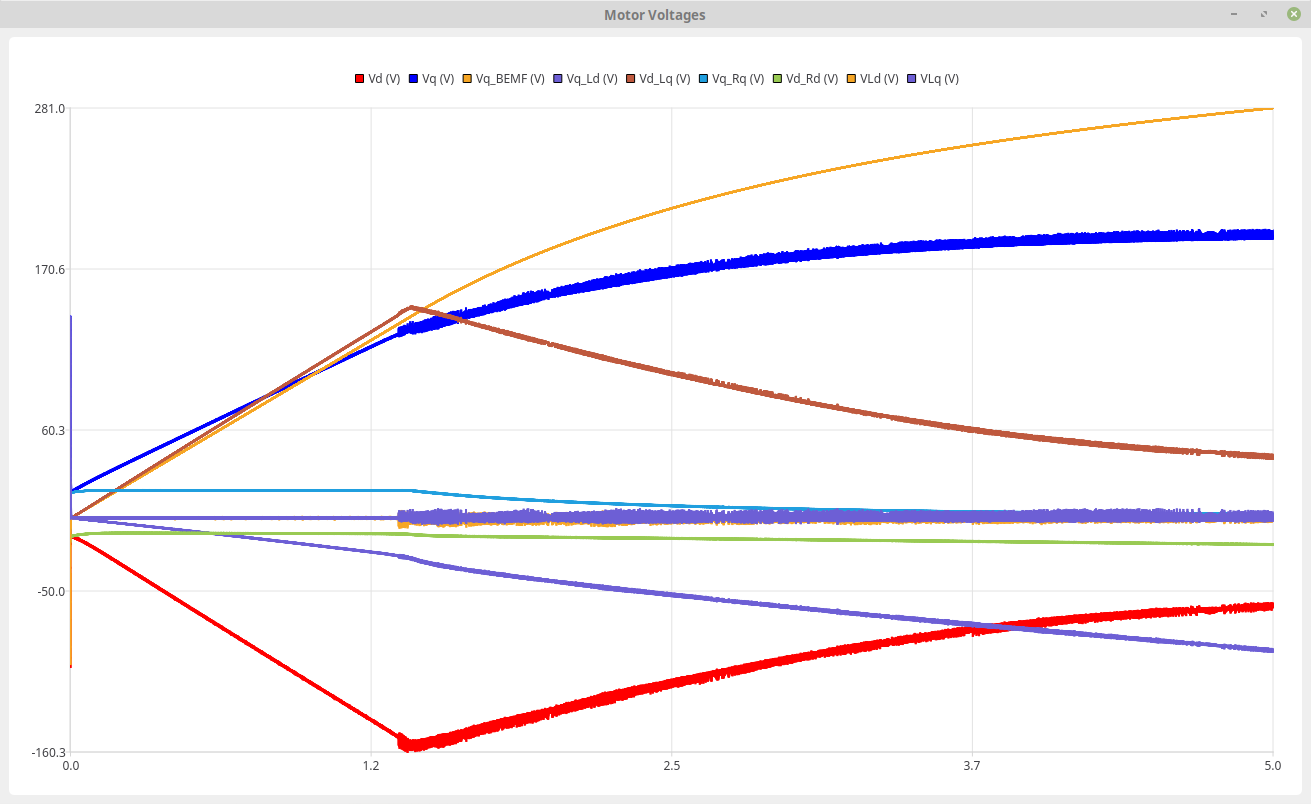 Vd and Vq are the same as on previous plots and are what are seen on the motor terminals (after the Park, Clarke translation). The rest are the voltages generated by the individual terms of the model equations: