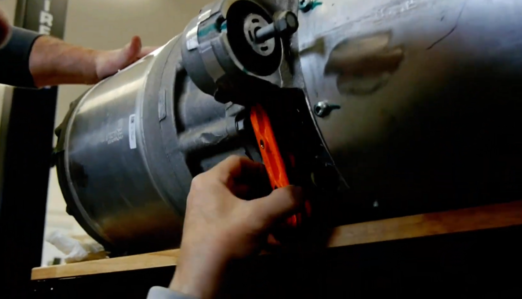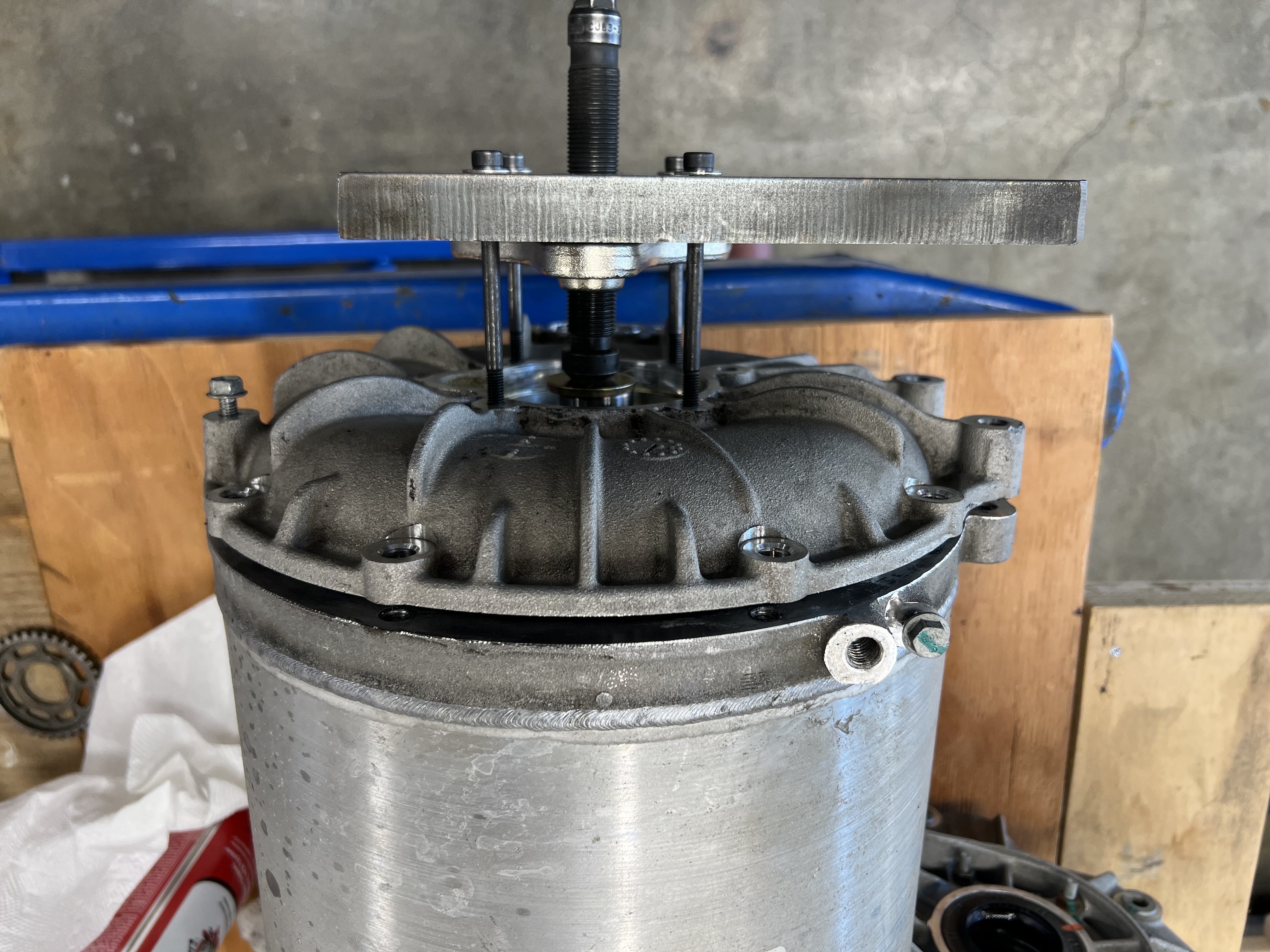 a fixture setup to allow enough pulling force to remove the rotor with the inside bearing remaining in the case.