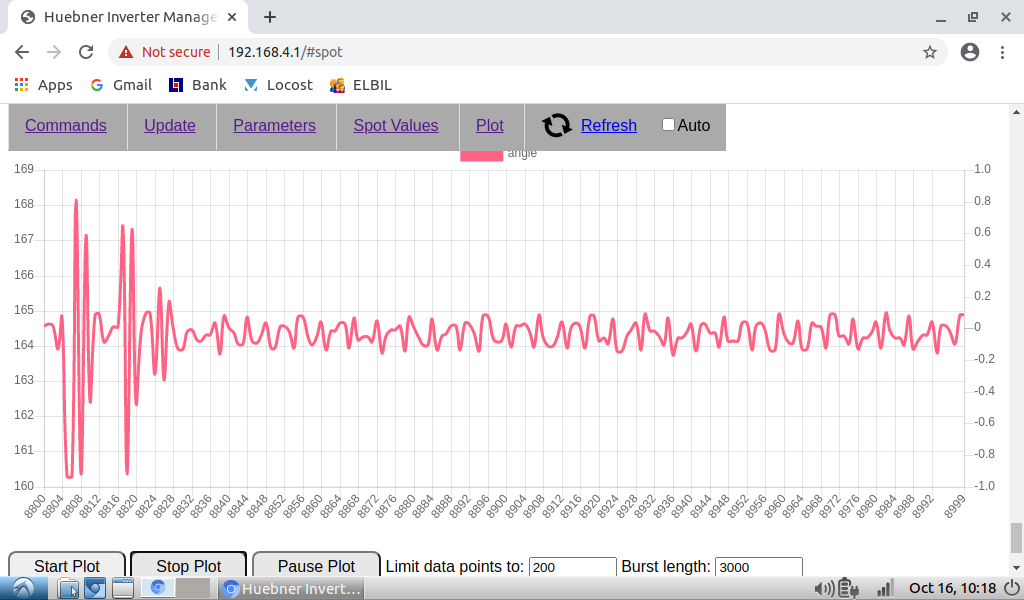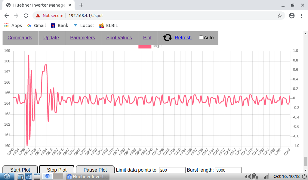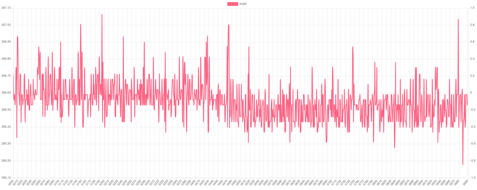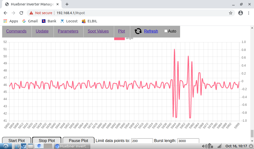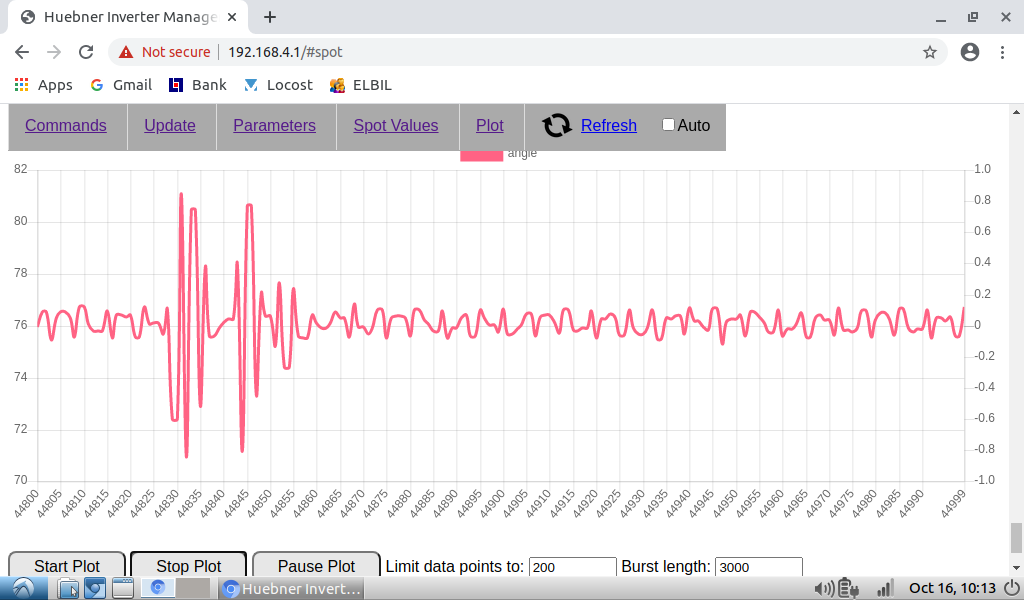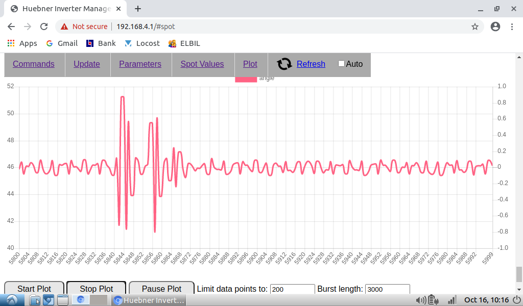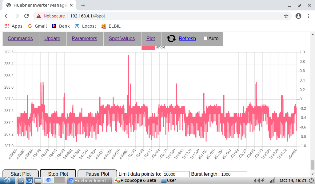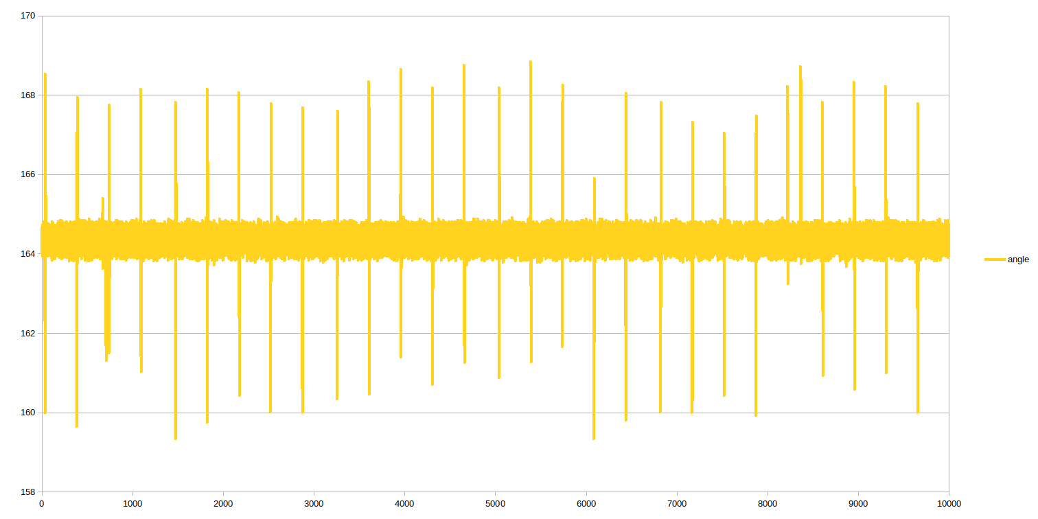 Regarding spikes in angle plot, to catch them I need to set 10000 data points and 1000 burst length. Then I catch them every time. With less data point I don't always find them.